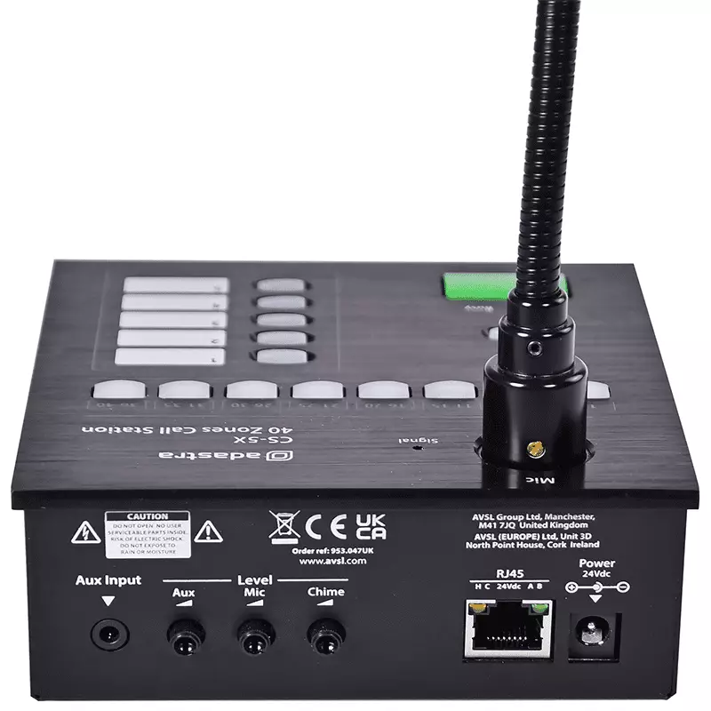 - Connectors: XLR, RJ45 (to RX45), 24Vdc power jack, 3.5mm aux in