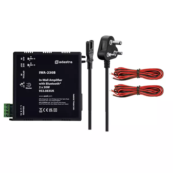 Stereo amplifier units for background music and public address in a minimalist housing for installation into cavity walls and ceilings. Class-D amplifier design operates cleanly and efficiently with minimal heat dissipation, combined with an internal digital switch-mode power section, which enables easy connection directly from the local mains supply. Bluetooth compatibility enables wireless streaming of audio files from a smart phone or other enabled device in addition to 3.5mm Aux input and an optical digital audio input, ideal for integrating into A-V systems. For discreet and trouble-free installation without any need for table-top or cabinet installation, these amplifiers can be combined with many different speaker types to provide the ideal sound system for any small to medium space or deployed in numbers to create a wide area sound installation.