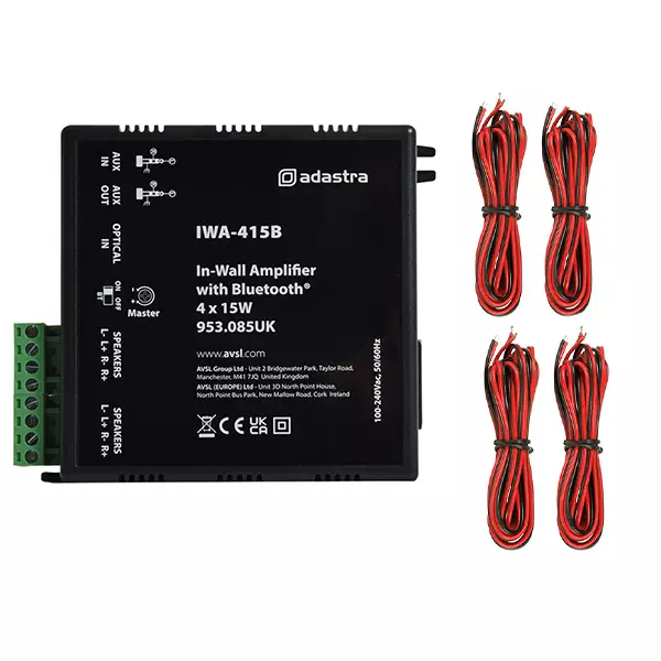 Stereo amplifier units for background music and public address in a minimalist housing for installation into cavity walls and ceilings. Class-D amplifier design operates cleanly and efficiently with minimal heat dissipation, combined with an internal digital switch-mode power section, which enables easy connection directly from the local mains supply. Bluetooth compatibility enables wireless streaming of audio files from a smart phone or other enabled device in addition to 3.5mm Aux input and an optical digital audio input, ideal for integrating into A-V systems. For discreet and trouble-free installation without any need for table-top or cabinet installation, these amplifiers can be combined with many different speaker types to provide the ideal sound system for any small to medium space or deployed in numbers to create a wide area sound installation.