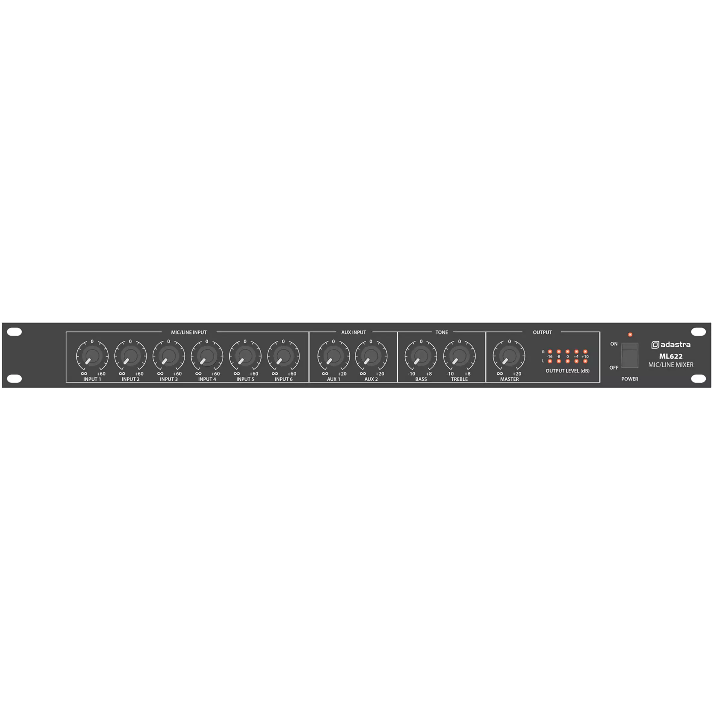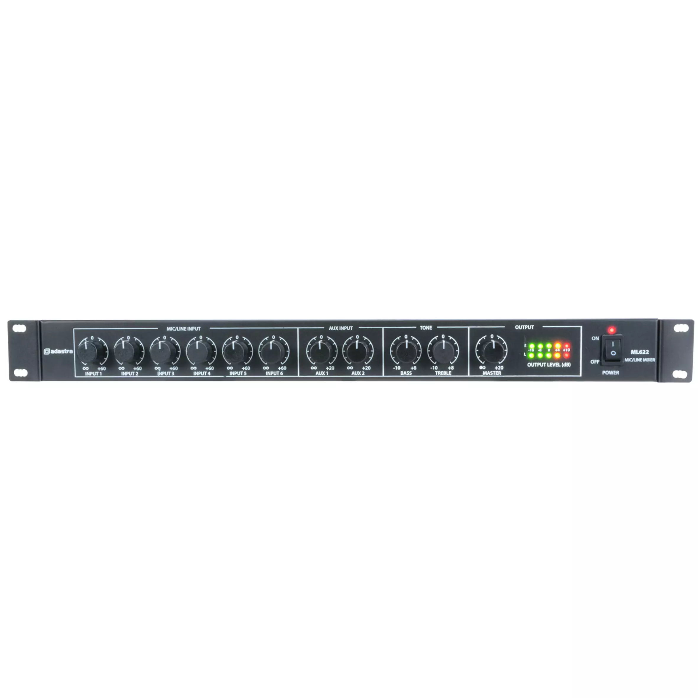 - Controls: 6 x Mic/Line level, 2 x Aux level, Treble, Bass, Master