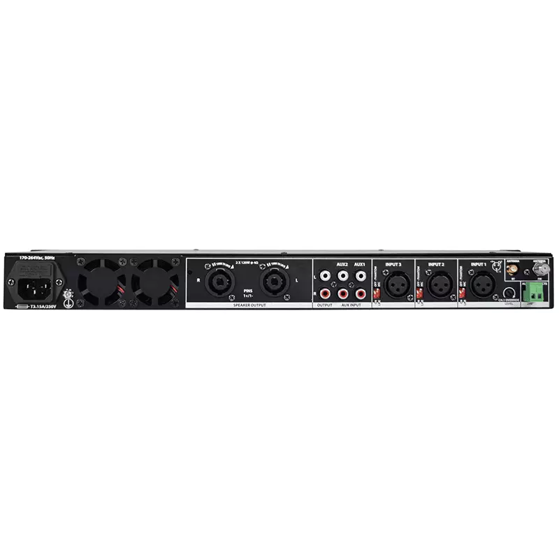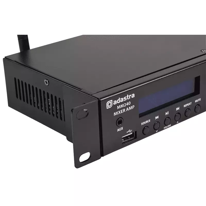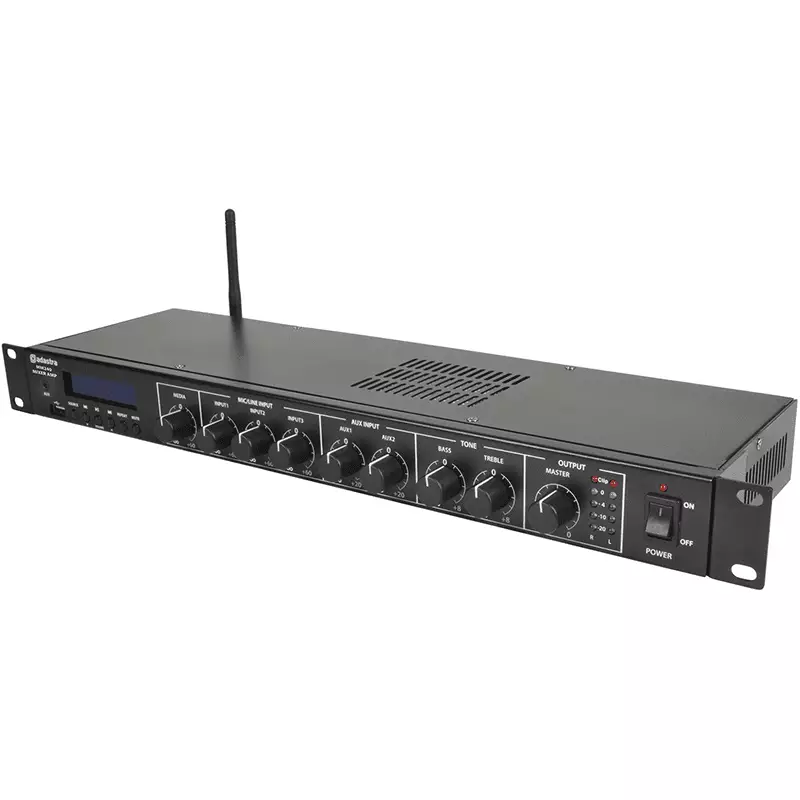 Compact 1U mixer-amp featuring a built-in media player with DAB+ and Bluetooth receiver. 3 mono inputs connect via XLR microphone or line input (switchable). Each of these inputs has switchable +20V phantom power for use with condenser microphones or D.I. boxes and channel 1 has a variable priority function. Two stereo auxiliary line inputs are provided on RCA connectors with a stereo line output. Media player operating modes include 3.5mm Aux input, USB audio player, DAB+/FM radio tuner and Bluetooth receiver for playback from a smart phone or tablet. Main left and right speaker outputs are connected using standard Speakon leads. Connect 2 or 4 speakers for a complete music and voice installation or mobile PA system for functions, conferences and fitness classes.