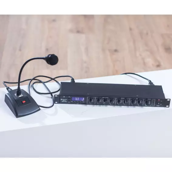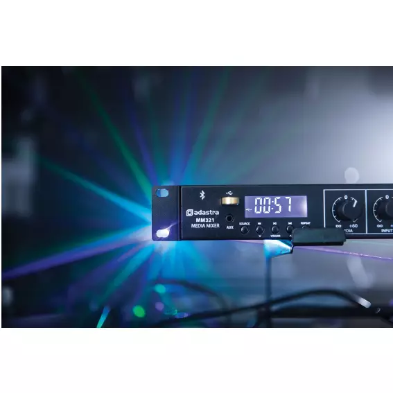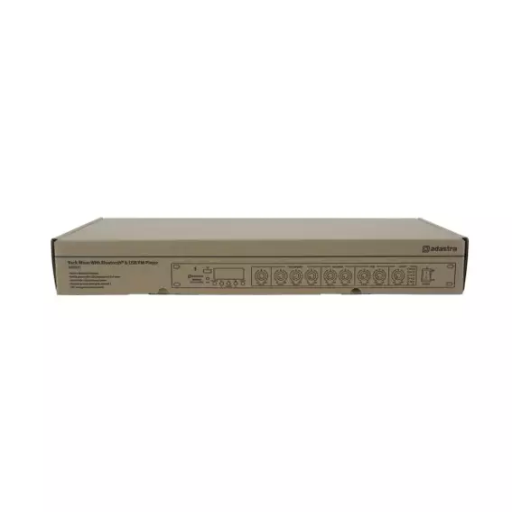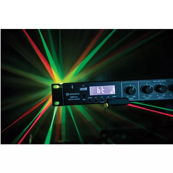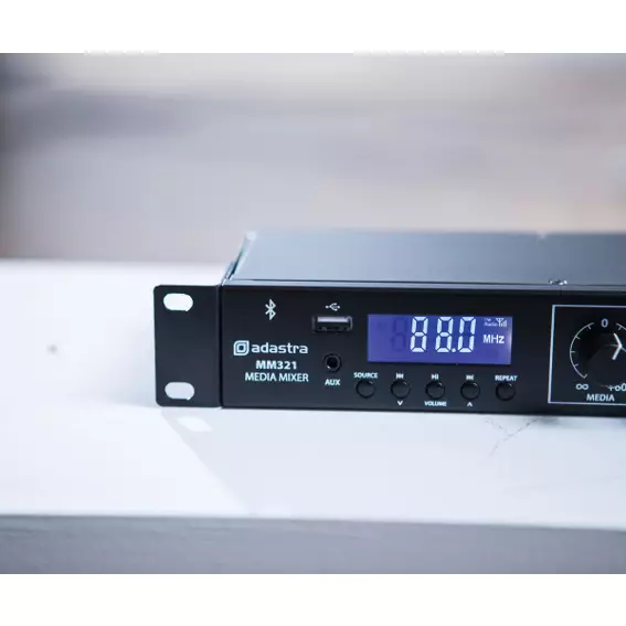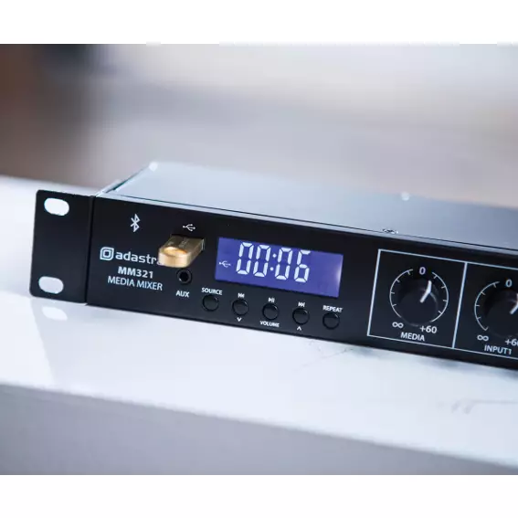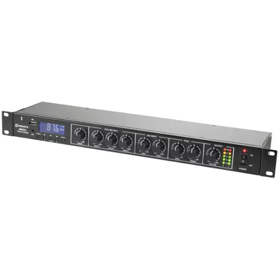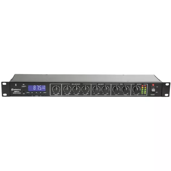 Rack-mountable 1U mixer with built-in media player and Bluetooth receiver. 3 mono inputs connect via XLR microphone or line input (switchable). Each of these inputs has switchable +20V phantom power for use with condenser microphones or D.I. boxes and channel 1 has a variable priority function. Two stereo auxiliary line inputs are provided on RCA connectors with a stereo record output. Media player operating modes include 3.5mm Aux input, USB audio player, FM radio tuner and Bluetooth receiver for playback from a smart phone or tablet. Main left and right outputs are fed to XLR with an additional mono summed output on 6.3 jack. Versatile yet easy to use as a main mixer for background music, public address and house PA systems.