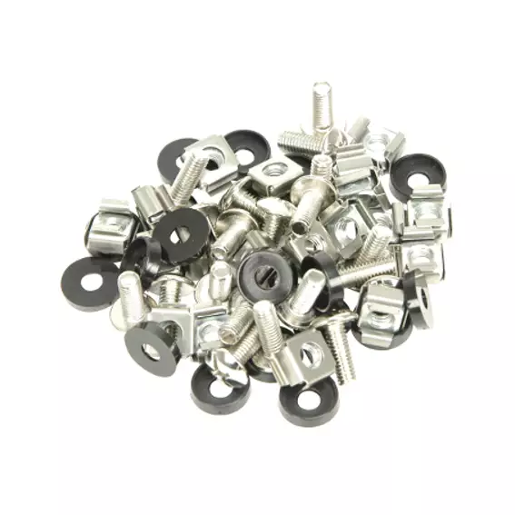 20 piece set of M6 captive nuts, bolts and plastic washers for fixing equipment to standard rack strip.