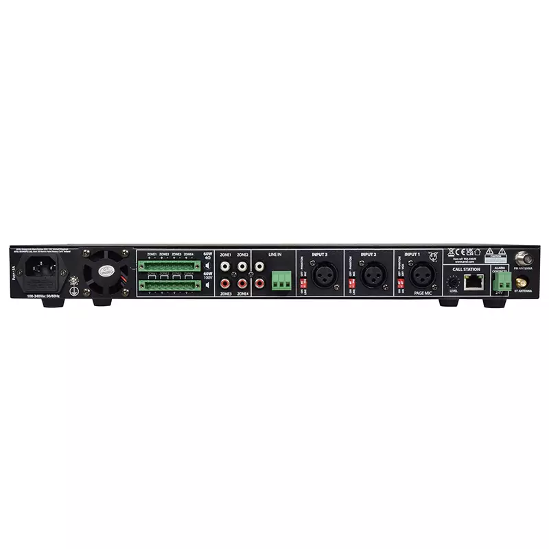 - Inputs: Paging mic, 2 x mic/line, 1 x line/media player
