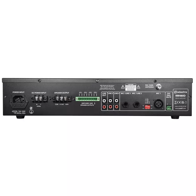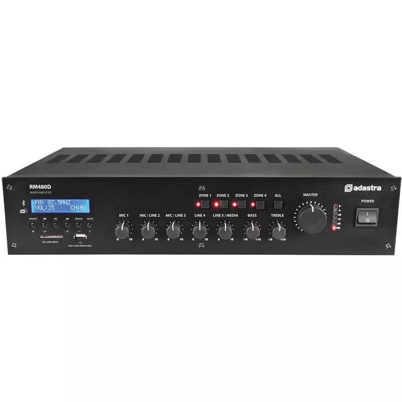 5-channel 19″ rack-mountable mixer-amplifier, tailored to commercial sound installations to power 100V line speakers or standard speakers down to a 4 Ohm load. Input options include XLR (with switchable phantom power), mic/line jack, and RCA line. Features an inbuilt DAB+/FM radio tuner, front-mounted SD/USB ports, and Bluetooth® connectivity, all controlled via an integrated media player for hassle-free playback. A switchable ‘voiceover’ feature automatically lowers the background music volume when a signal is detected via mic input 1 and rear panel 24V contacts can mute all except mic input 1 when triggered. Outputs on screw terminal are via 4 switchable zones with a separate “always on” output for priority alert speakers.