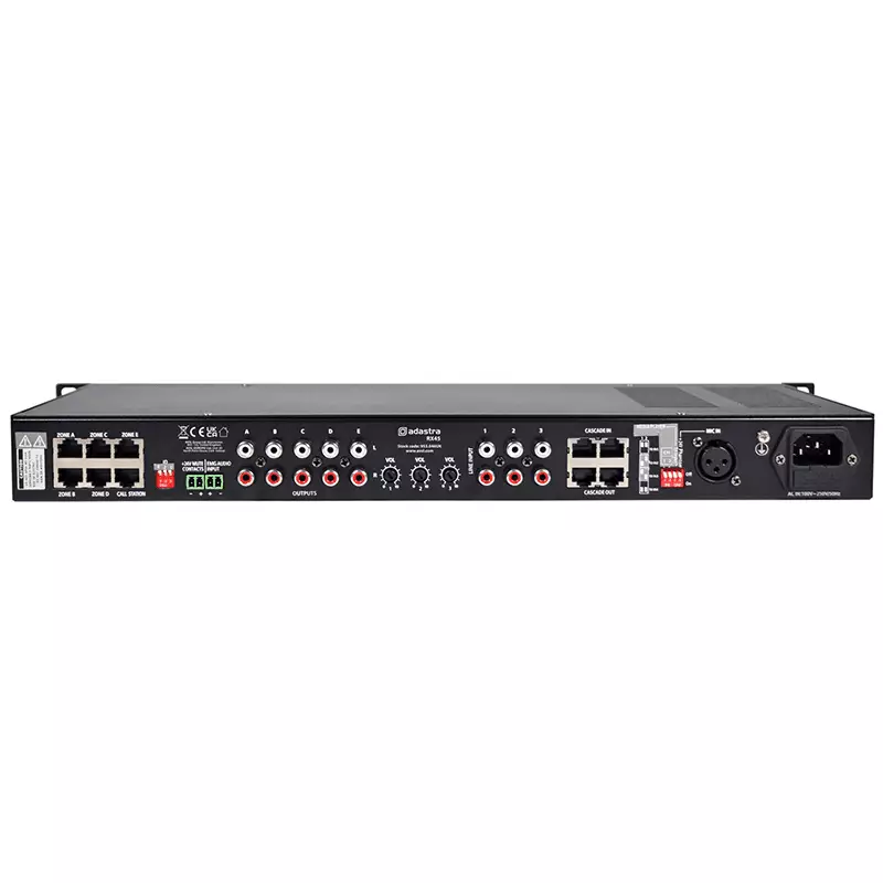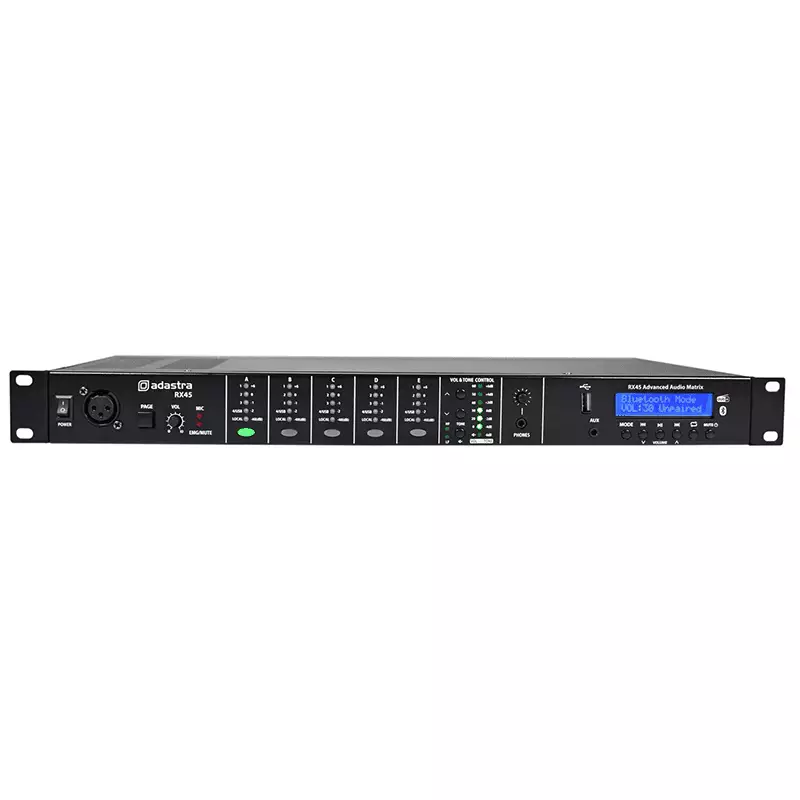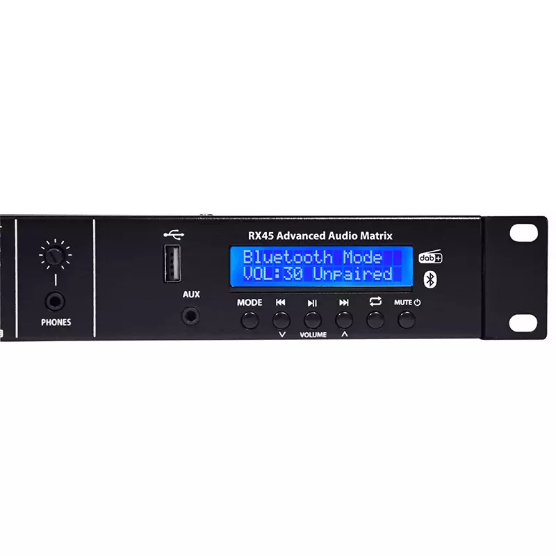 RX45 is a 1U rack-mountable audio matrix feeding 4 selectable inputs to 5 stereo outputs. An inbuilt audio player section features playback from USB media, DAB+ tuner or Bluetooth. Each zone output has a push button and LED ladder on the front panel for selecting the input source and adjusting level and tone settings in the master section. Connecting optional TR86 wall plates via CAT5 cable enables remote source and level selection for any zone. The output for the selected zone may be monitored through a headphones output on the front panel. The RX45 system is expandable using multiple RX45 units cascaded together via dual CAT5 links, with DIP switches to assign one of 8 different IDs to each connected RX45 unit, providing up to 40 distinct zones. Additional DIP switches can be set to link the audio player from one unit to one or more connected slaves.