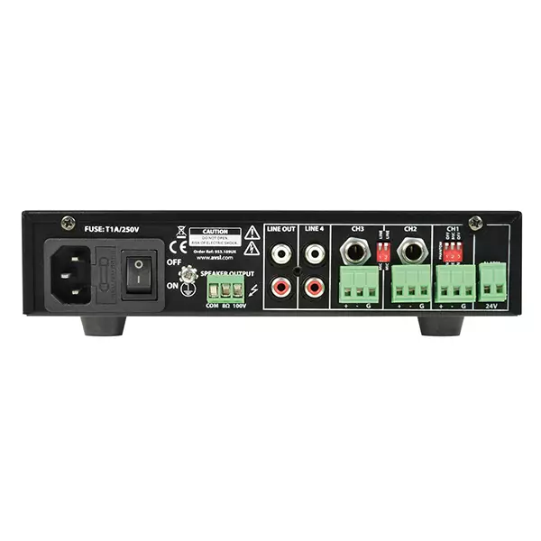 100V mixer-amplifiers with an integral mixer in a half width 1U housing. 3 switchable mic/line inputs, an RCA line input and a 3.5mm Aux input are governed by front panel volume controls and a Master output control. Mono output to either 100V line or 8 ohms speaker load is connected via a removable screw terminal connector on the rear panel. Supplied with rack-mounting hardware which can be configured to mount a single unit against a wall or under a worktop. Designed as a versatile solution for small to medium PA installations.