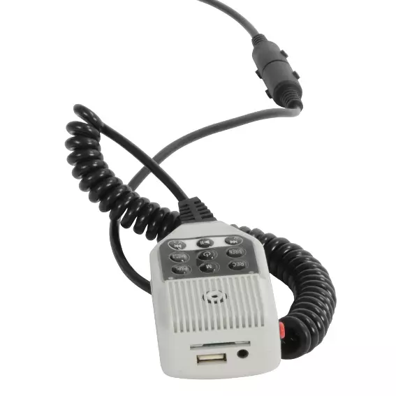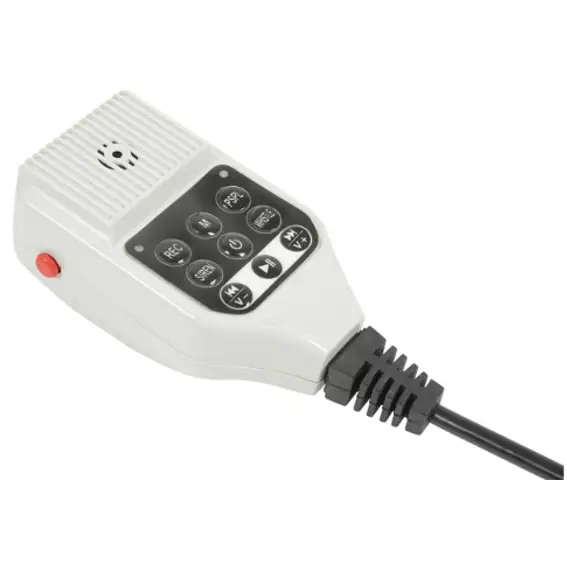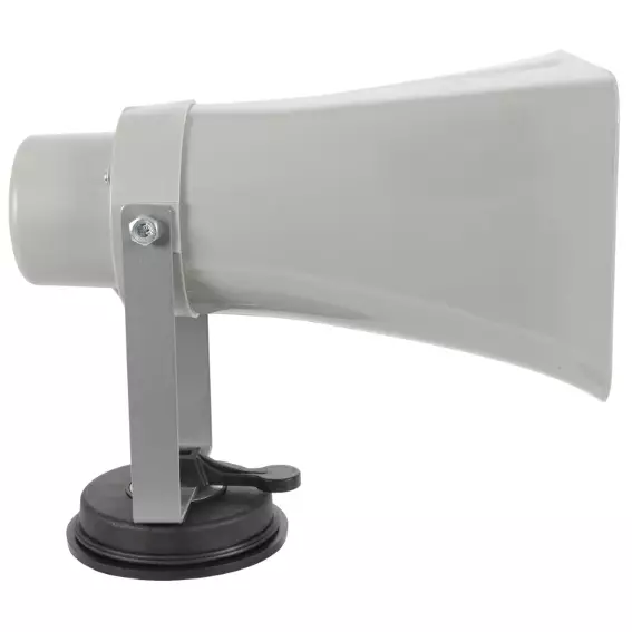 Active horn speaker with adjustable bracket and removable suction cup base for attaching to a vehicle roof. Power is connected via a 12V cigar lighter lead, delivering up to 25W power output. A detachable handset houses a push-to-talk microphone along with all controls and connectors for other functions. The top of the handset has ports for USB and SD media to allow audio playback and a 3.5mm auxiliary line input for external audio sources. An integral record function enables a speech message to be recorded up to 120 seconds and played back as a loop. Siren and whistle alerts can be activated by push buttons and, an inbuilt Bluetooth receiver enables wireless connection to a smart phone for playback of audio files or as a remote microphone via various available Bluetooth Microphone apps. Designed for mobile announcements or permanent installation for public address or alerts.