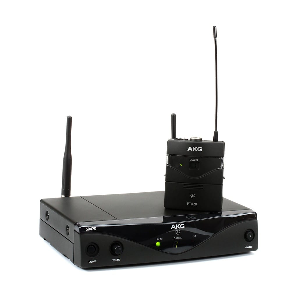 The WMS420 wireless microphone system provides a highly flexible as well as easy to use solution. The ultra high frequency system is set up within seconds and is equally suitable on stage as well as in locations where a single- or multi channel solution is needed. The entire WMS420 wireless system consists of the SR420 stationary receiver, HT420 handheld transmitter and the PT420 pocket transmitter. The HT420 handheld transmitter is available with the patented D5 dynamic microphone acoustic. This capsule guarantees maximum rejection against feedback, reduced handling noise and the famous AKG sound. Both transmitters are shipped with charging contacts that enable the use of rechargeable batteries. Moreover the transmitters offer exceptional eight hours of operation time from a single AA size battery, which dramatically reduces the operating costs in day-to-day use. The detachable receiver antennas allow the use of professional accessories, such as antenna splitters and remote mounted directional antennas for multi channel systems. The WMS420 series includes three different bodypack sets. The head-worn set includes the high performance C555L condenser microphone. The presenter set includes the professional C417L lavalier microphone. The guitar set includes an instrument cable. With the AKG WMS420 system up to eight channels can be run simultaneously.