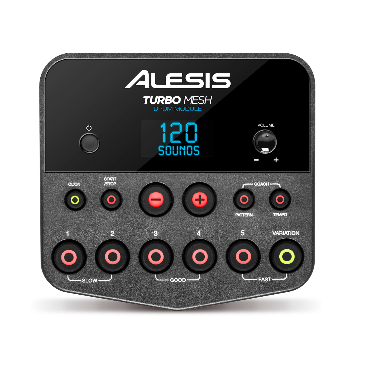 At the heart of the Turbo Mesh Kit is the feature-packed Turbo electronic drum module. The Turbo drum module features 10 new classic and modern-sounding drum kit presets, custom-designed by Alesis. These kits contain 120 individual drum sounds and utilize Intelligent Dynamic Articulation™ technology to provide incredibly realistic sound and playability. The Turbo drum module can be connected to an external sound system or amplifier using its stereo ¼” outputs, or you can practice privately using the ⅛” headphone output.
