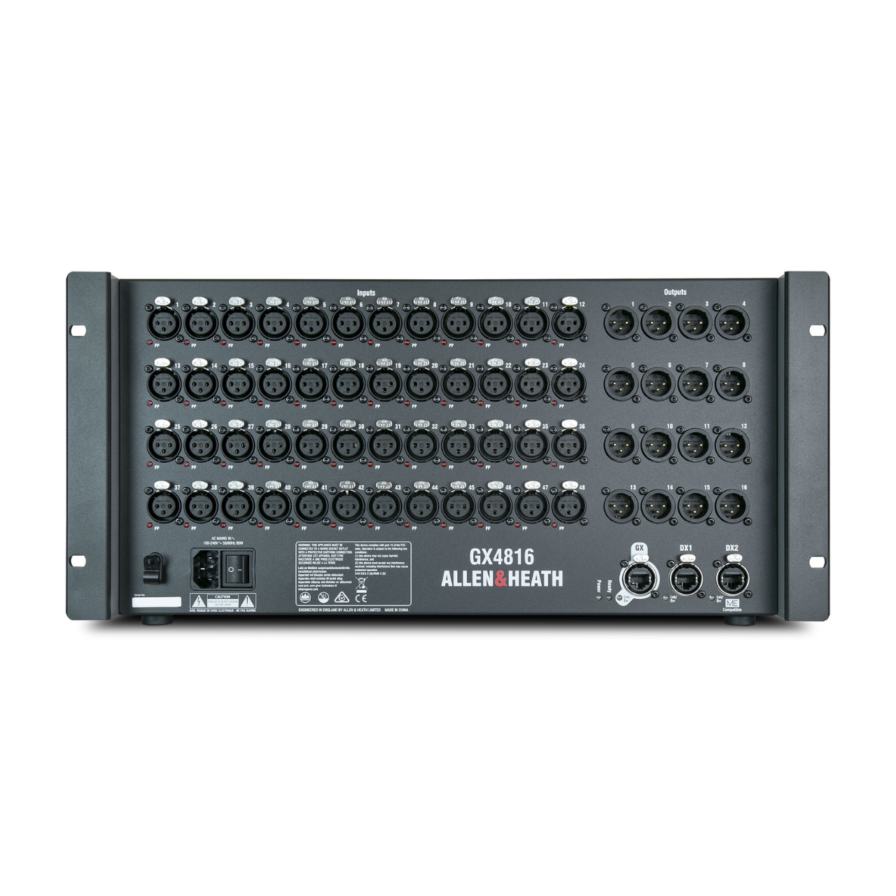 Each GX4816 is loaded with 48 dLive mic preamps with independent Phantom Power LED indicators, plus 16 XLR line outputs. Additionally, 2 DX ports are provided for connection to up to 4 DX Expanders for further I/O expansion. Connection to a ME Personal Mixing System is possible via the DX2 socket when used with SQ or Avantis.