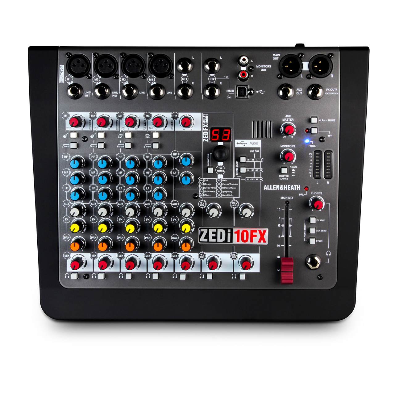 The Allen & Heath ZEDi-10FX mixer boasts built-in effects including lush reverbs, delays, and combinations of the two. Even better, tap tempo allows you to quickly sync delay effects with the tempo of your music. If desired, you can route the effects return to the headphone mix while leaving them out of the main mix – perfect for giving vocalists some “comfort reverb” during tracking.