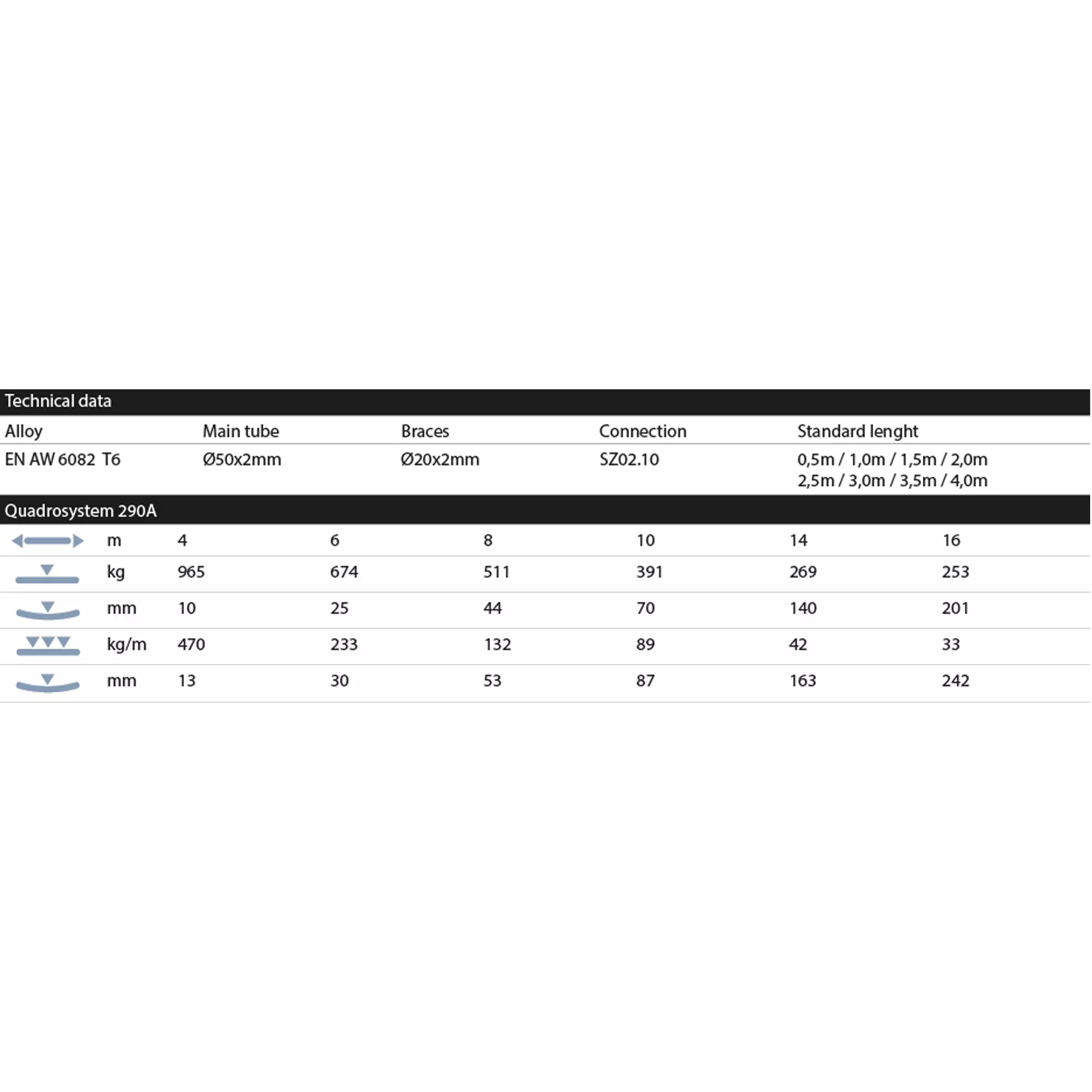 System 290A is made of main tube 50x2mm and braces 20x2mm. It has got SZ02.10 connection.Thanks to their spatial design, the aluminium trusses look attractive and are very strong. They can be arranged in different ways and are successfully used as elements of stage roofs, trade fair structures, exposition structures, big screen structures, LED display screen and projection screen support frames, lighting “gates” and sound “gates”, as well as frameworks of advertising banners or stage decorations. Each truss is of the highest quality which is confirmed by ISO DIN 4113 and TÜV certificate granted to our company. Each element is thoroughly inspected.