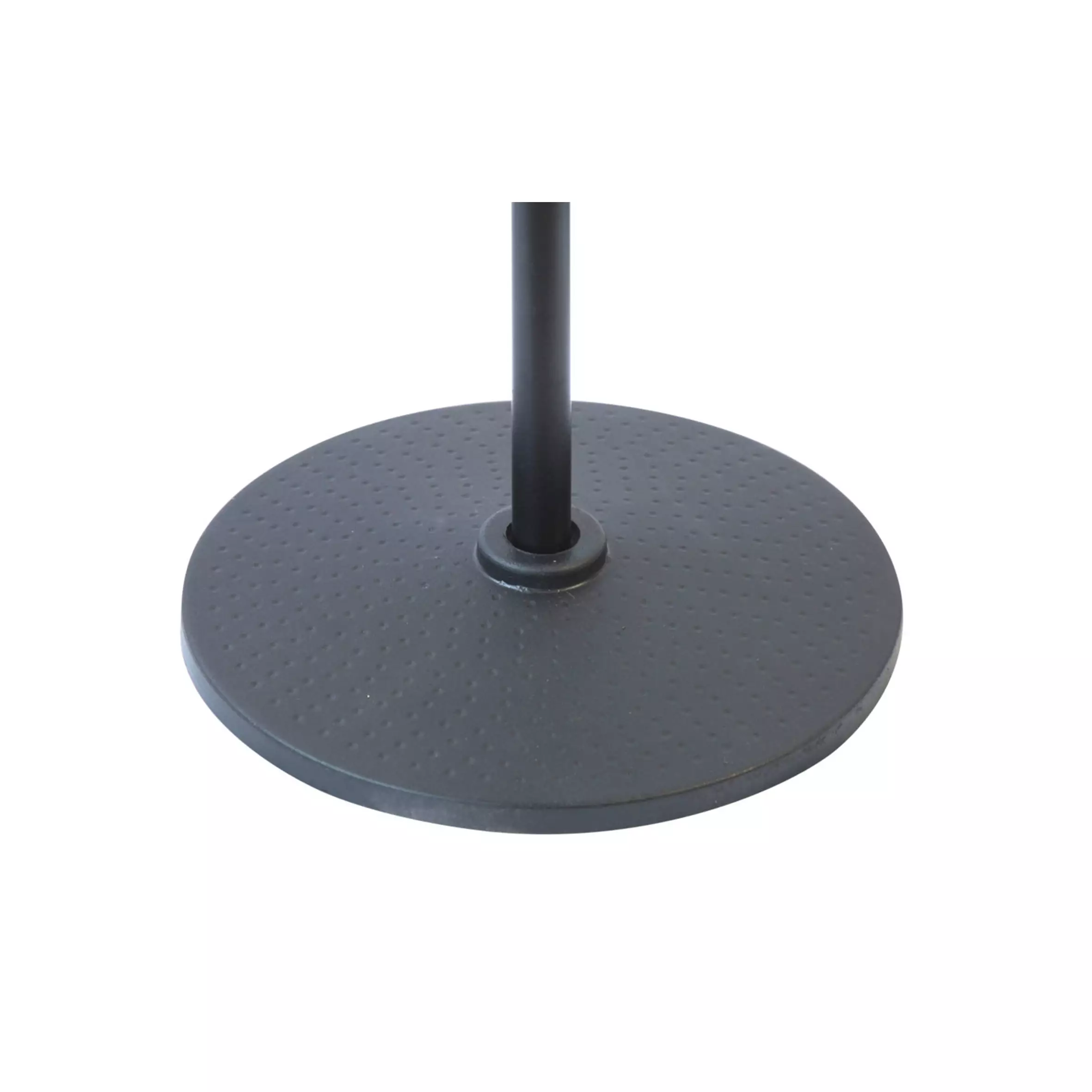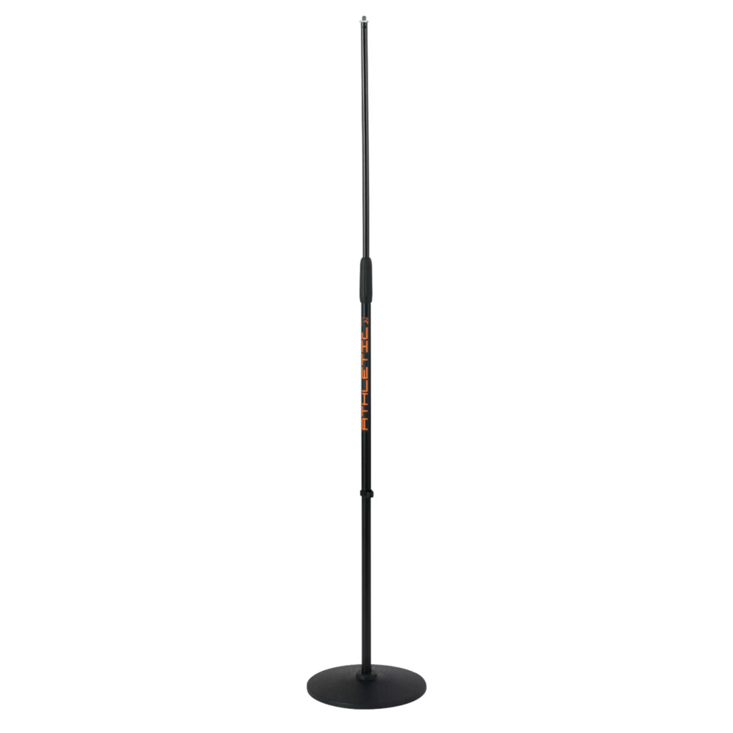 A universal, upright microphone stand mounted on a plastic-coated, cast-iron disk. Perfectly balanced, ensures full comfort of the performer.