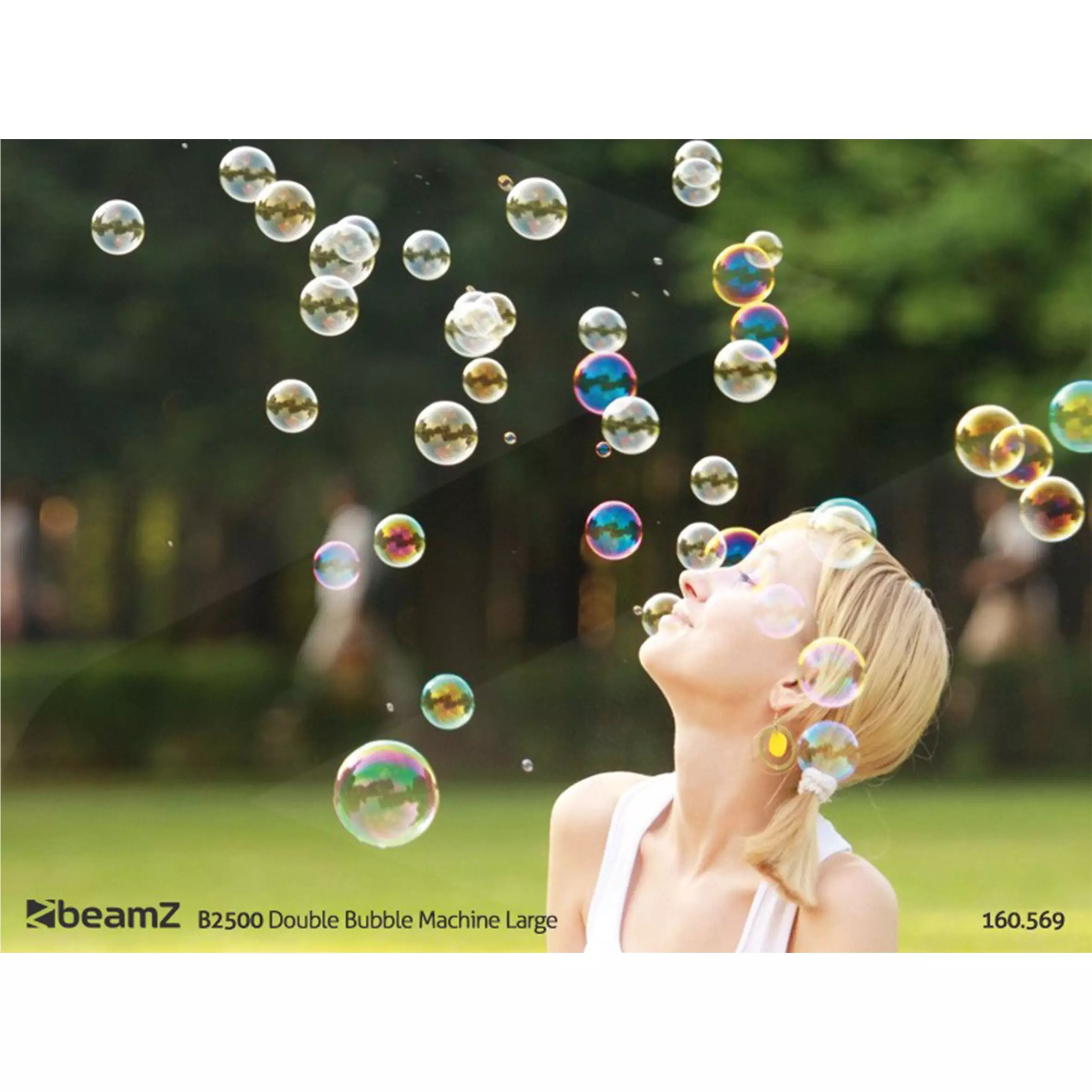 This new, attractive and reliable bubble machine with double wheels has a large range and produces a swirling effect thanks to the dual blowerfans distributing the bubbles better and blowing them up in the air. The machine creates millions of colorful bubbles.