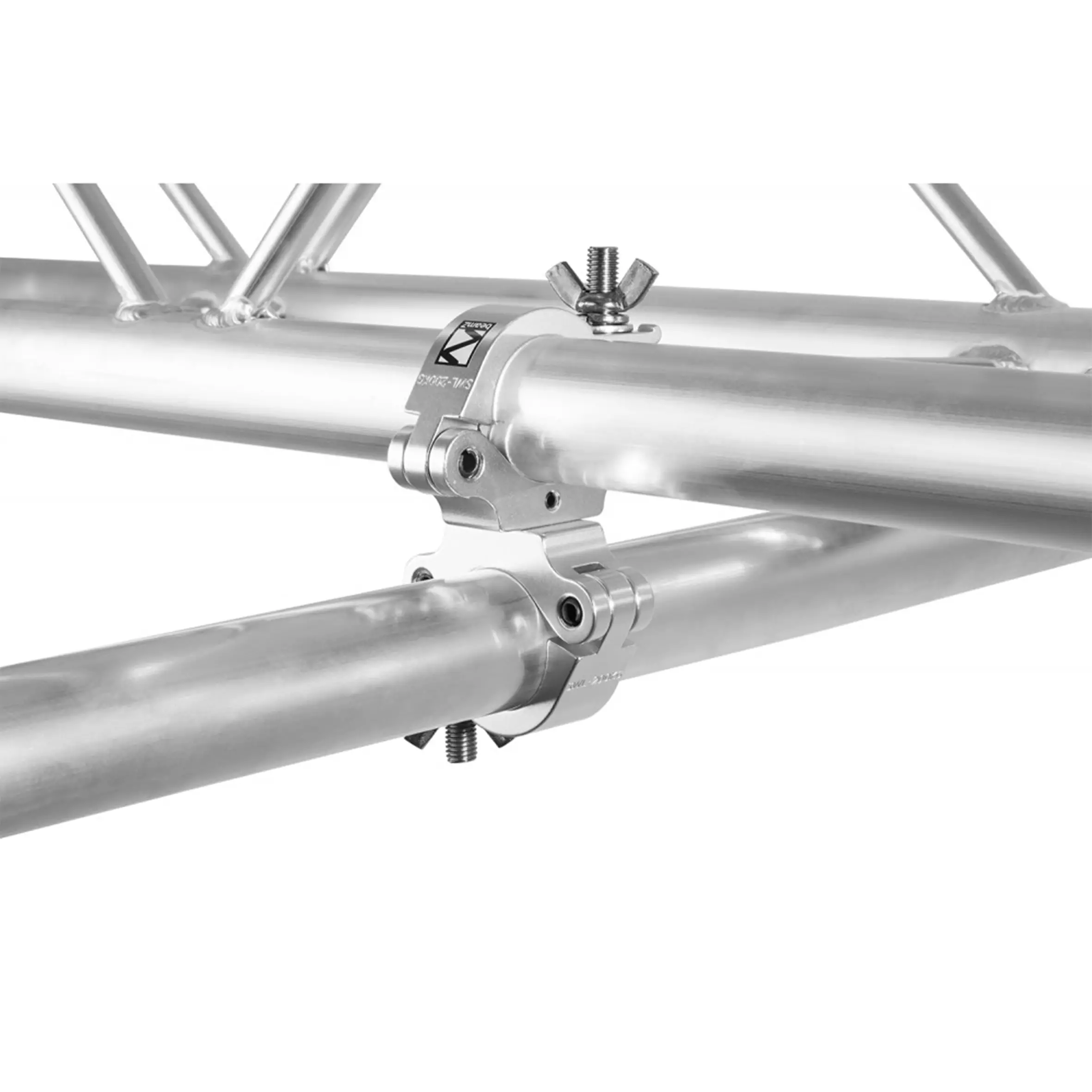 Heavy duty universal aluminium slimline swivel coupler for pipe and truss mounting fixtures. Swivel Coupler provides a firm fixing between adjacent bars whilst allowing 360 degrees of movement. High-strength aluminum construction.