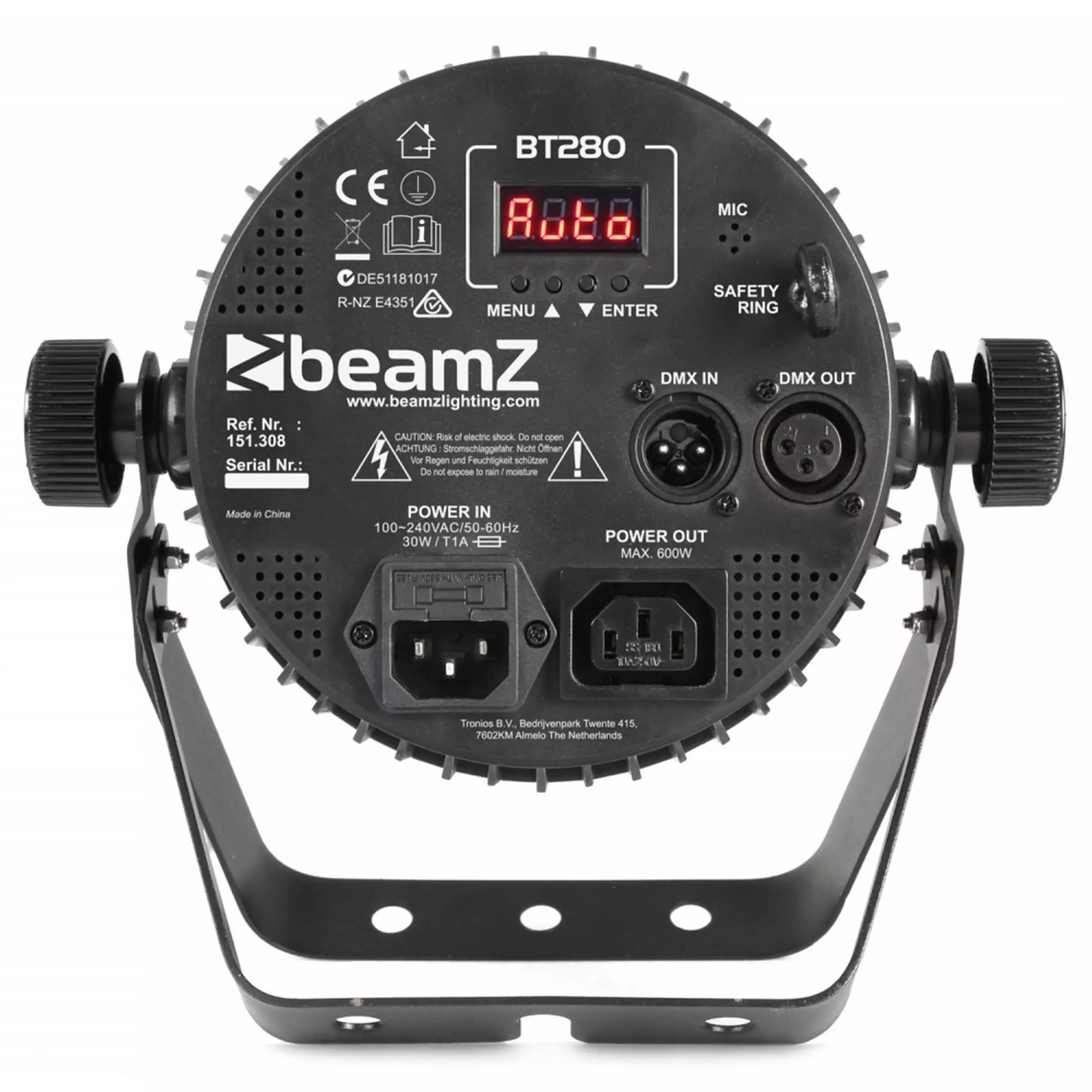 A high power parcan in ABS housing with 7x 10W RGBAW-UV (6-in-1) LEDs. Designed to be flat so it can fit in your trusses and equipped with IEC in/out for daisy chaining multiple units together. The BT280 has preset programs that can be used in stand-alone mode. In the DMX settings there is the choice of a 2,3 and 4-channel mode with preset colour macro’s or a 10-channel mode where you can control every single colour individually. The same can be done in stand-alone mode with the supplied remote control. The ABS housing and double stand make the BT280 also ideal for rental features, being lightweight and easy to setup.