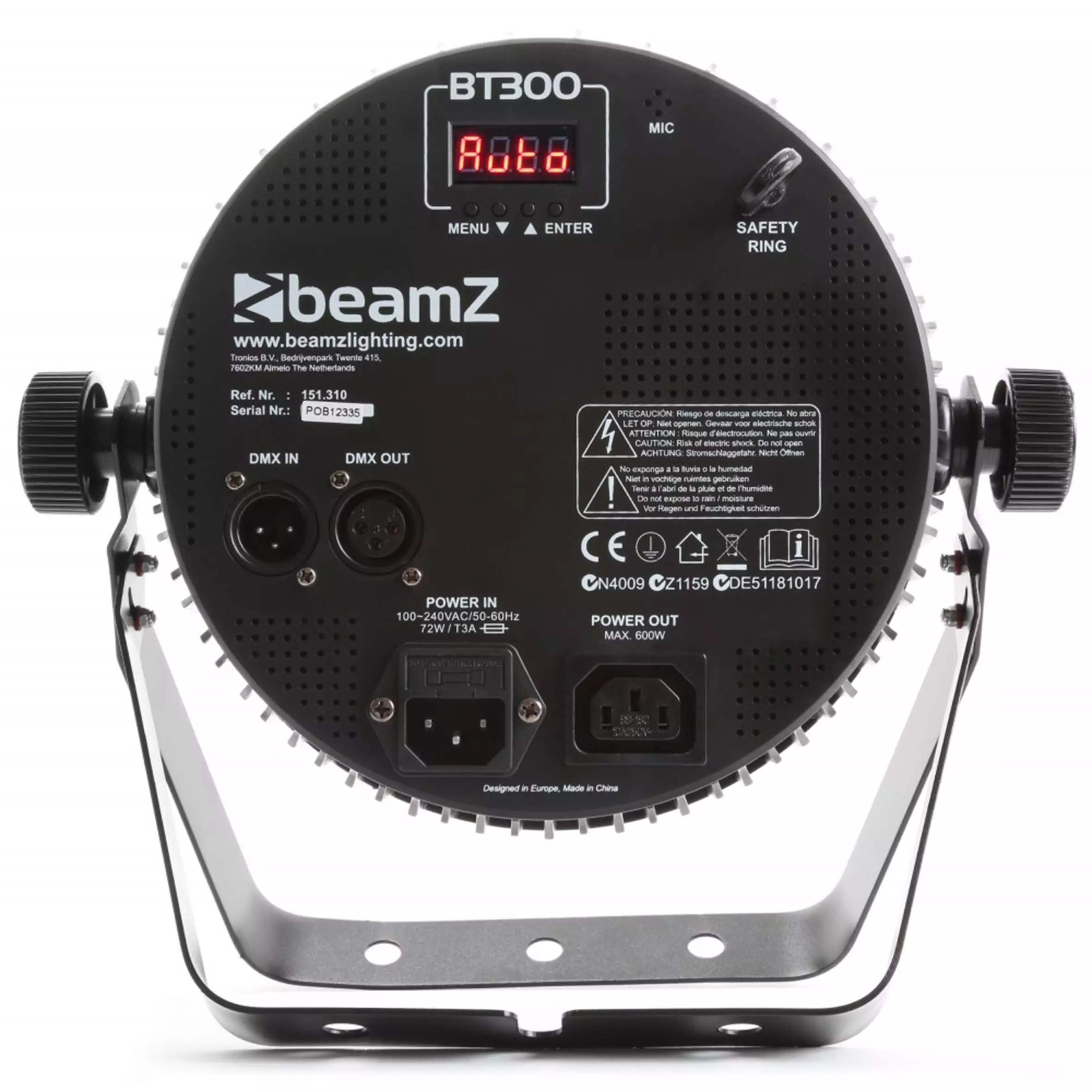 A high power parcan in ABS housing with 12x 12W RGBAW-UV (6-in-1) LEDs. Designed to be flat so it can fit in your trusses and equipped with IEC in/out for daisy chaining multiple units together. The BT300 has preset programs that can be used in stand-alone mode. In the DMX settings there is the choice of a 4-channel mode with preset colour macro’s or a 10-channel mode where you can control every single colour individually. The same can be done in stand-alone mode with the supplied remote control. The ABS housing and double stand make the BT300 also ideal for rental features, being lightweight and easy to setup.