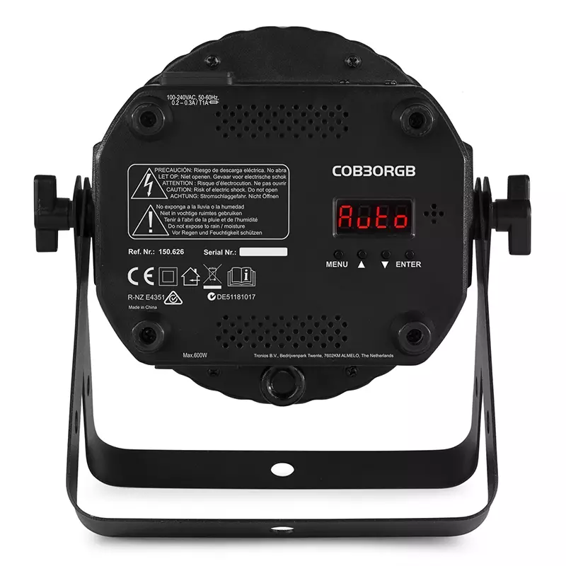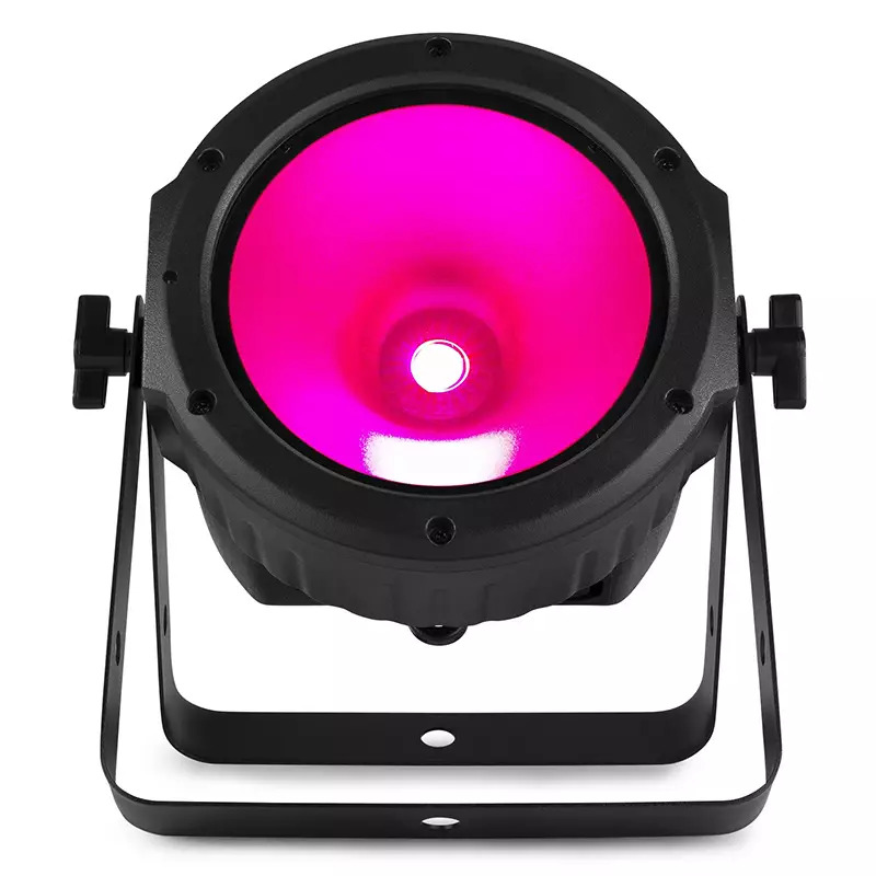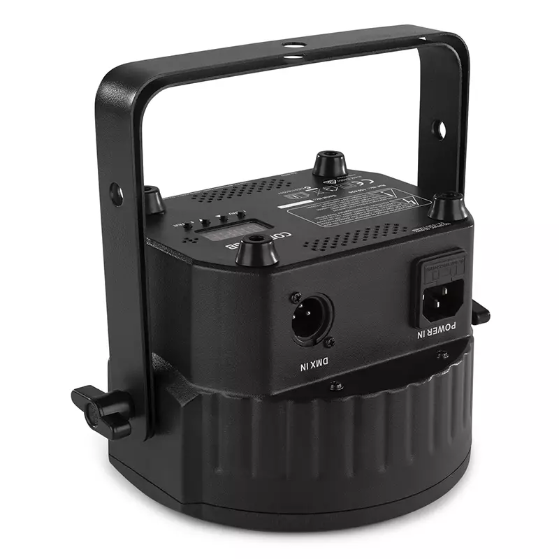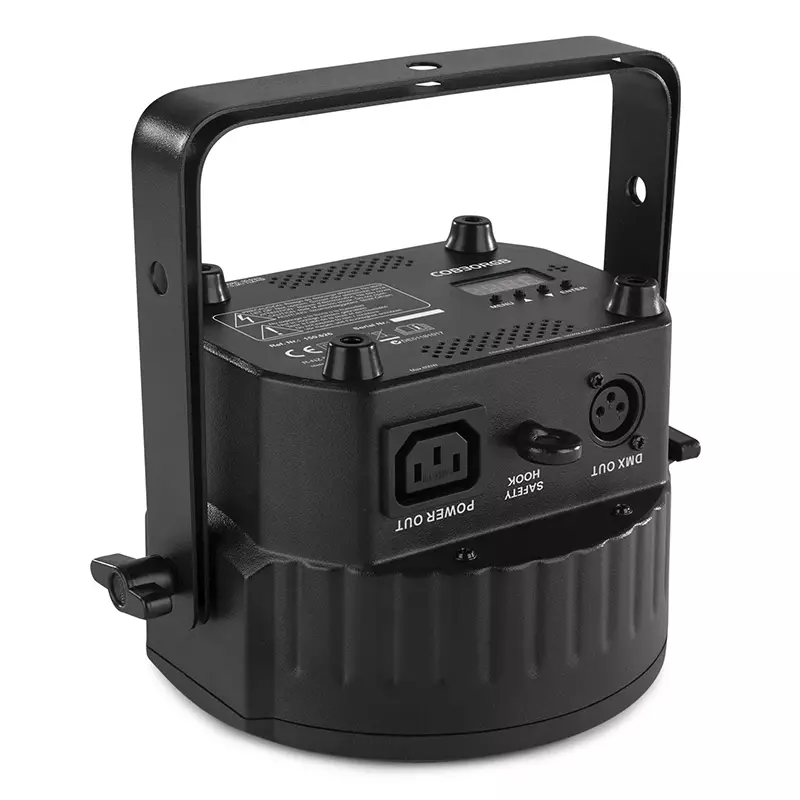 The COB30RGB is a flat PAR equipped with a high power 30W COB (chip-on-board) LED and creates a 30° Beam Angle. The fixture offers a magnitude of static colours and colour mixing. Features built-in automated and sound-activated programs, strobe and electronic dimming for use on the fly, or create your own looks using the 8-channel DMX mode. The infra-red remote control simplifies operation and eliminates the bother of programming. Possibility of linking several units.