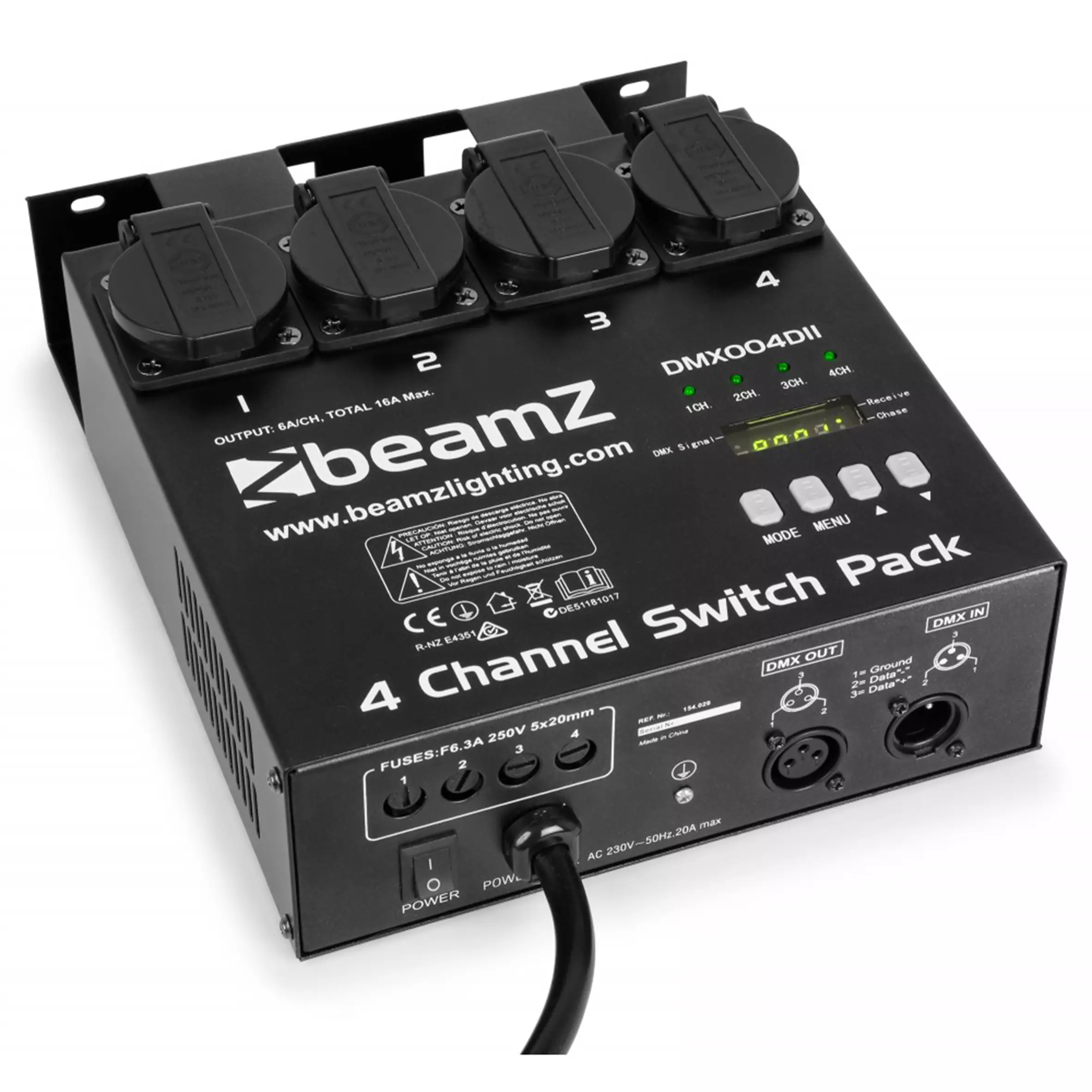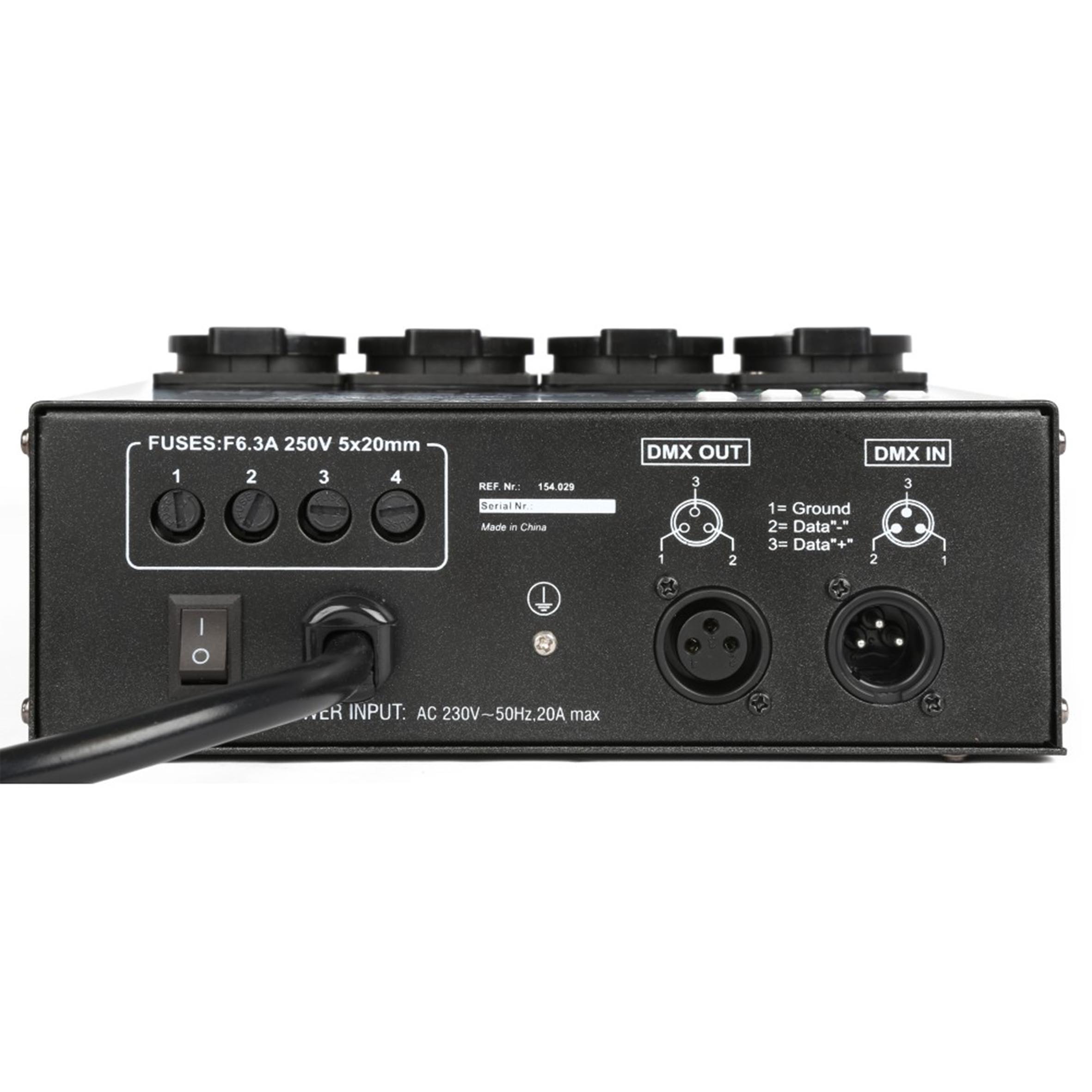 A 4-channel DMX switch pack switching light effects such as PAR lights on and off, through the built-in programmes, standalone or in DMX mode. The speed of the 16 built-in programs can be controlled. Channel-control takes place via the easy access menu.