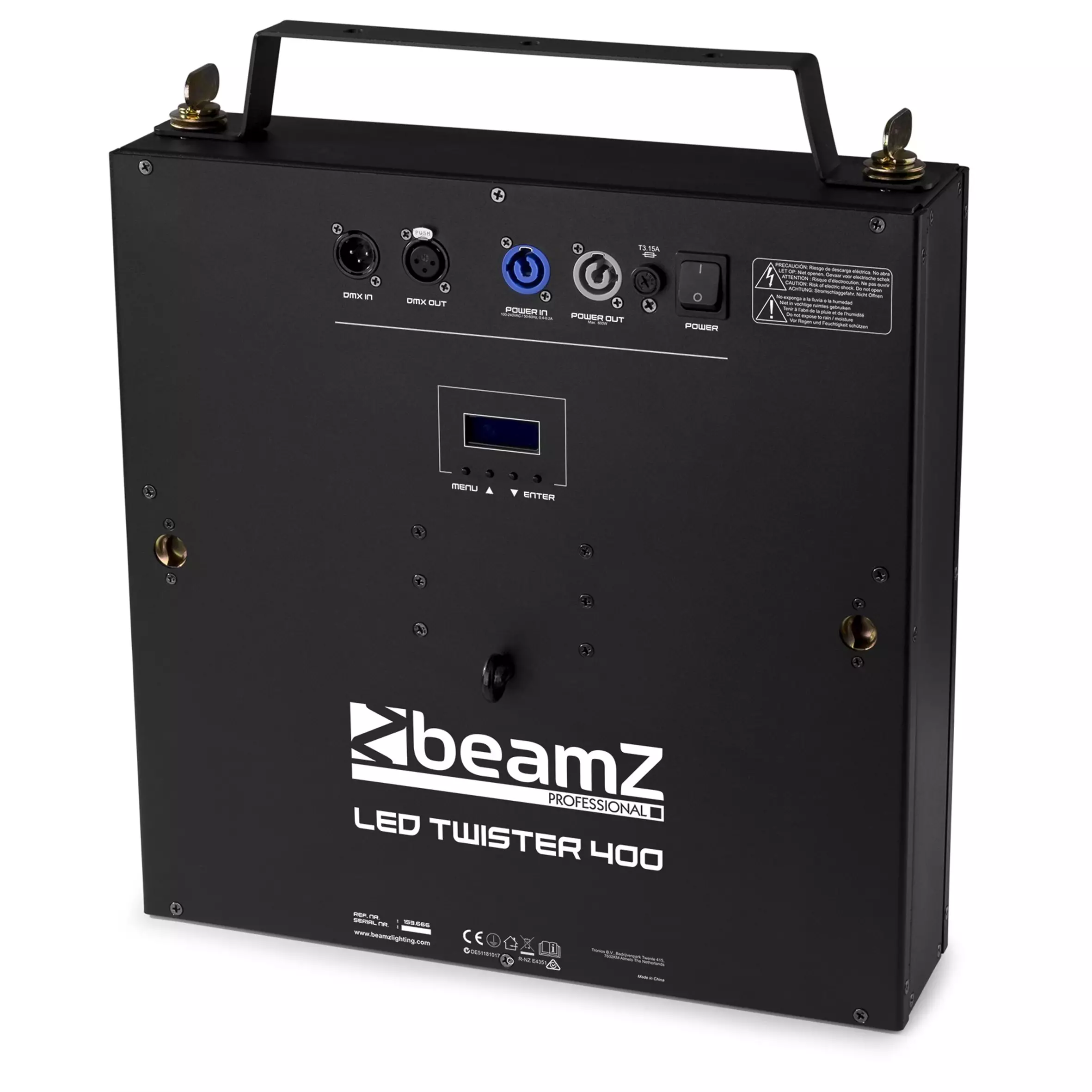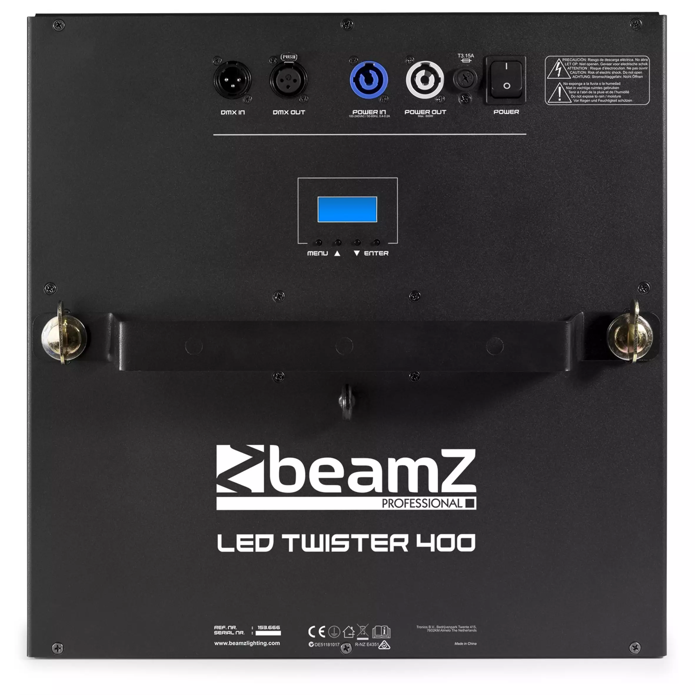 Glow with the flow! The Led Twister 400 is a unique and stylish LED Fan effect known from TV studios and big festivals. The Twister 400 is equipped with in total 116 x 5050 SMD RGB LEDs, divided over 6 blades and 8 sections LED bars in the front and can be controlled via DMX as a stroboscopic effect with full RGB colour mix. Also the rotation speed can be set variably via DMX. This double effect creates vibrant lighting and different spectacular visual effects.