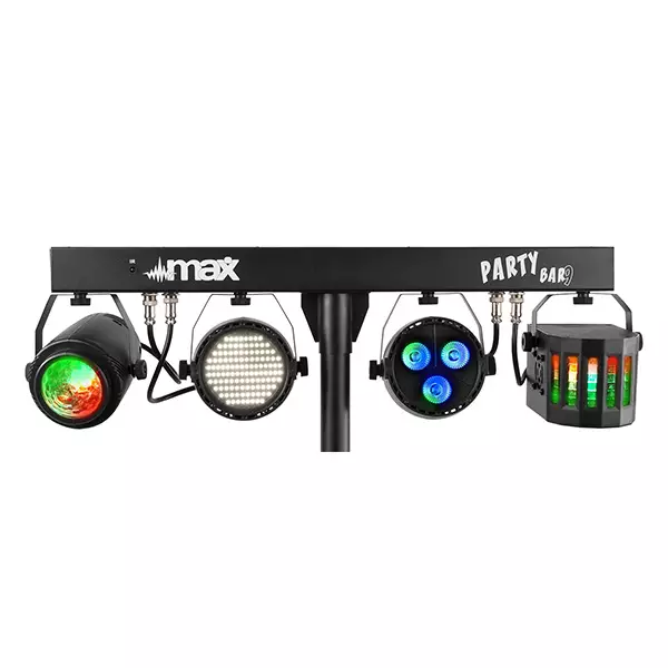 The MAX PartyBar Series consists of a number of complete kits fitted with spectacular LED light effects. All sets are provided with high-intensity LEDs in different colours. This series of Party Bars is plug and play and can be controlled via DMX, IR remote control or auto and sound-activated programs selectable from the control panel with LED display and push buttons. A tripod stand is included for quick and easy setup. Specially designed for stages, parties, entertainers and all other special events.