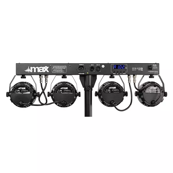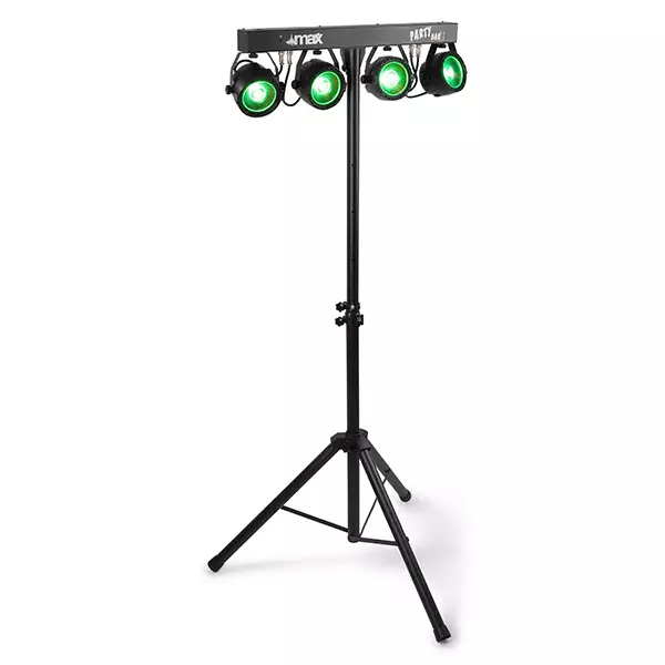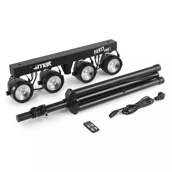 The MAX PartyBar Series consists of a number of complete kits fitted with spectacular LED light effects. All sets are provided with high-intensity LEDs in different colours. This series of Party Bars is plug and play and can be controlled via DMX, IR remote control or auto and sound-activated programs selectable from the control panel with LED display and push buttons. A tripod stand is included for quick and easy setup. Specially designed for stages, parties, entertainers and all other special events.