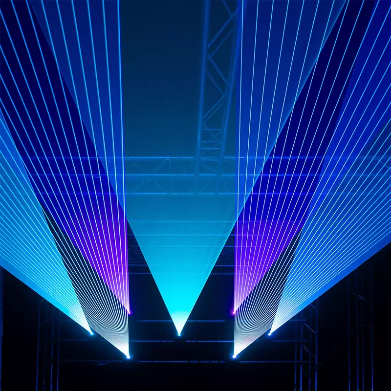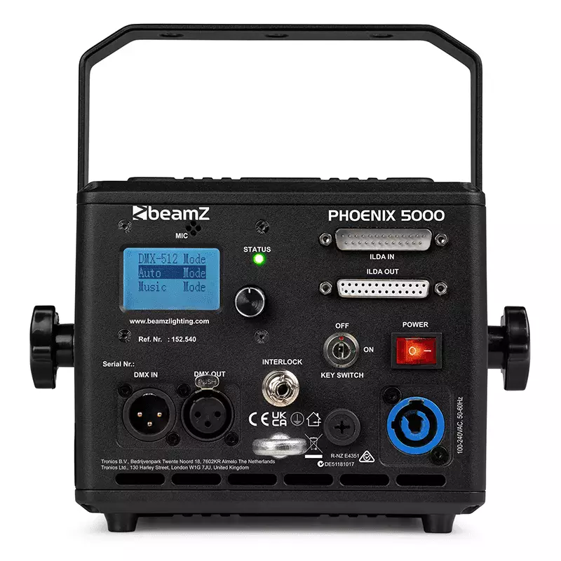 The beamZ Phoenix Laser series offers powerful animation lasers with over a hundred built-in effects and patterns. These lasers feature analog modulation, allowing for the display of up to 16.7 million color tones and the ability to “dim” the laser beam output, for audience safety. The rear panel includes a DMX in/output with 3-pin XLR connectors and an ILDA in/out connection, the standard for linking laser displays to control devices via an ILDA cable. When using a DMX controller, the Phoenix lasers provide 10 or 34 DMX channels. Additionally, these lasers can operate in sound-activated mode, thanks to the built-in microphone. The package includes 2 keys for the key switch, a remote interlock bypass, and a remote control.
