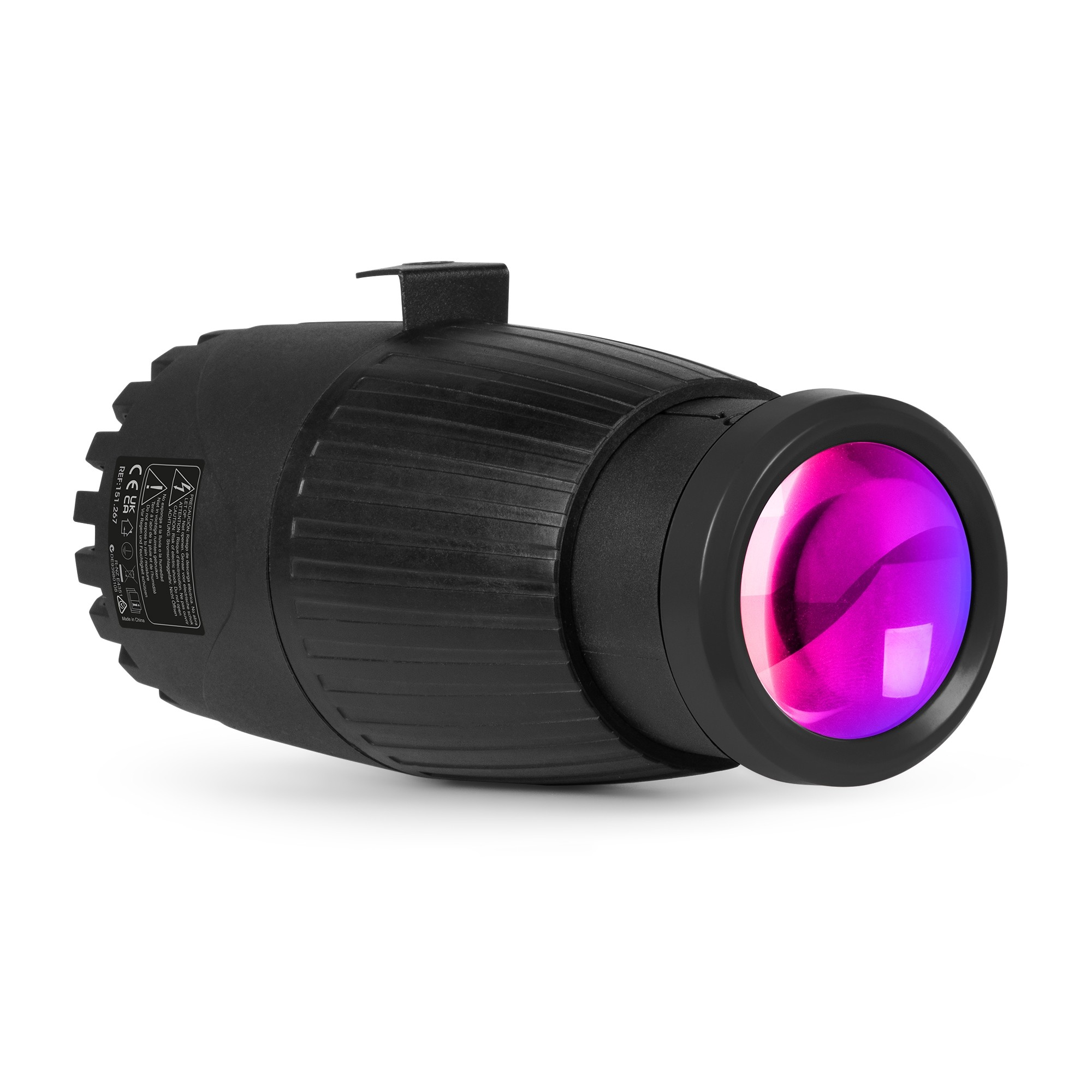 The PSZ18W is a powerful pin spot with a bright 18W LED and manual zoom for maximum control! Choose from 16 colours and 3 cool modes (static colour, breathing, and strobe), all easily managed with the included remote. Twist the lens to adjust the spot size just right—goodbye fixed focus! With its narrow beam, it’s perfect for lighting up a mirror ball, creating that magical Milky Way effect as the light dances over the mirrors. And here’s a bonus: the spot remembers its last setting, even after you switch it off.