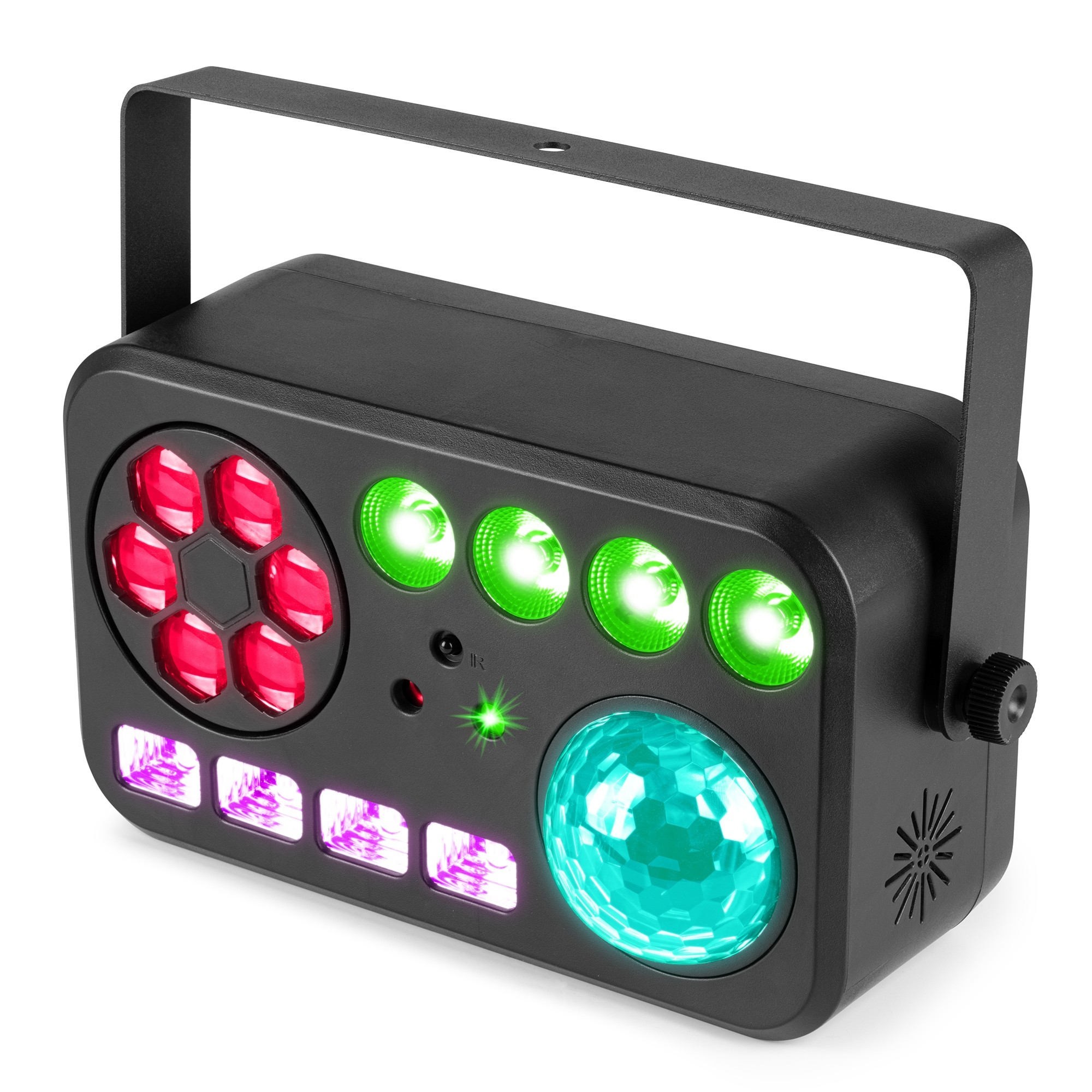 • 6-in-1 effect with LED Bee Eye, Water Wave, PAR, UV light, strobe and Double Pattern Effect
