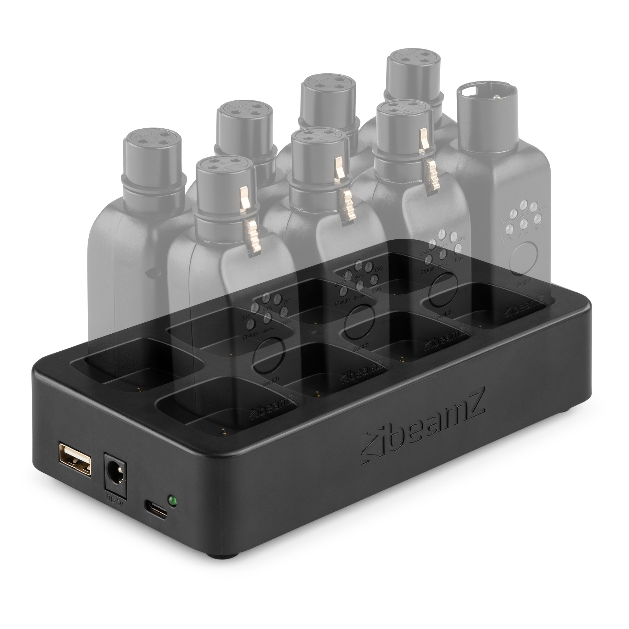 The beamZ WDM1 EazyLink System turns any wired DMX system into a convenient wireless DMX system! This means you can convert any DMX-equipped light effect wirelessly using the direct wireless communication technology of the EazyLink dongles. The system is incredibly easy to use: simply connect the transmitter and receiver to an XLR connector where you would normally plug in a DMX cable. The transmitters and receivers can be charged separately, but a docking station is also available (optional) suitable for 8 EazyLink dongles.