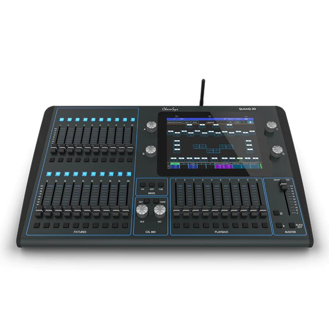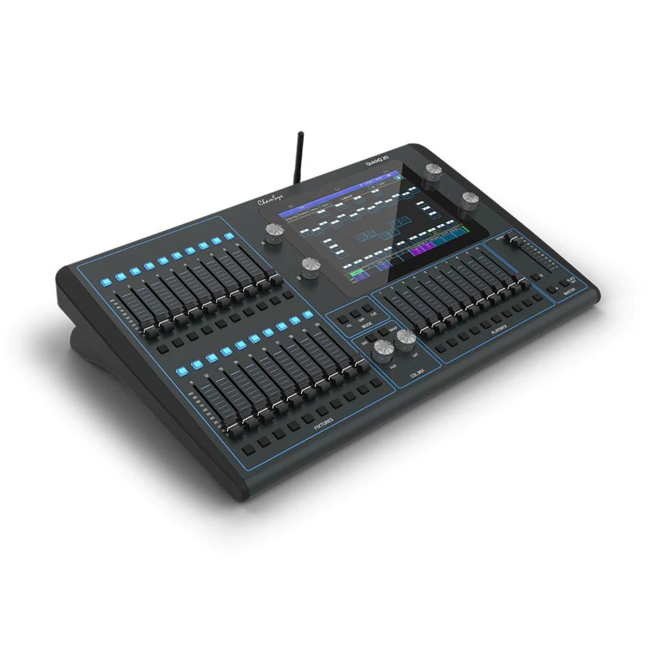 - 20 multi-function fixture faders with three different modes – Fixture, Group and Cue