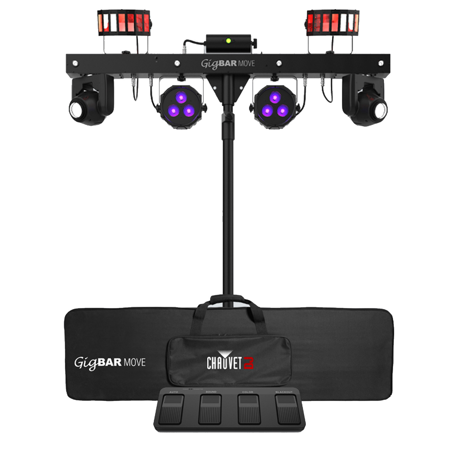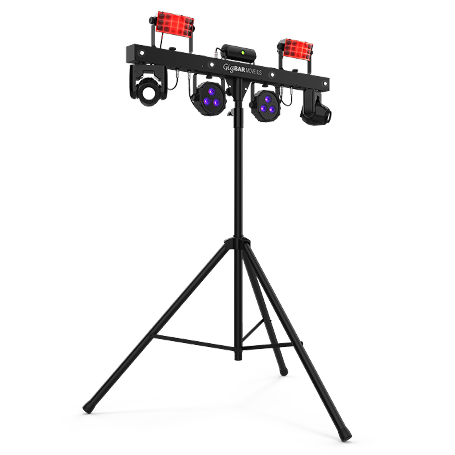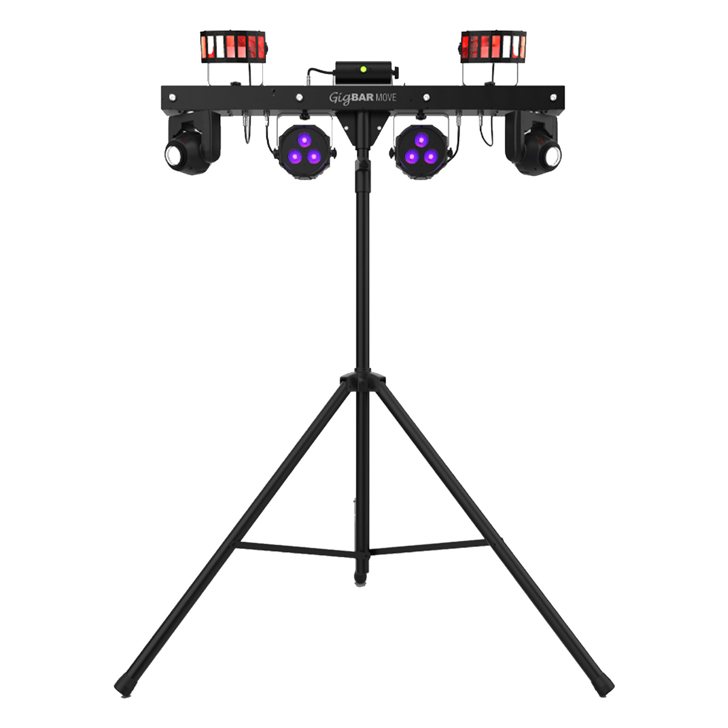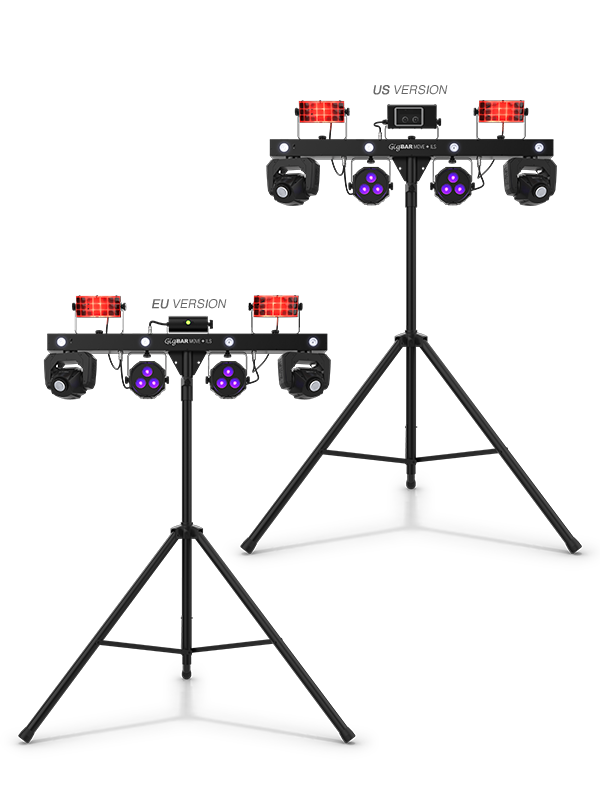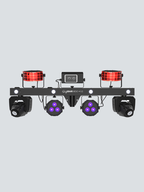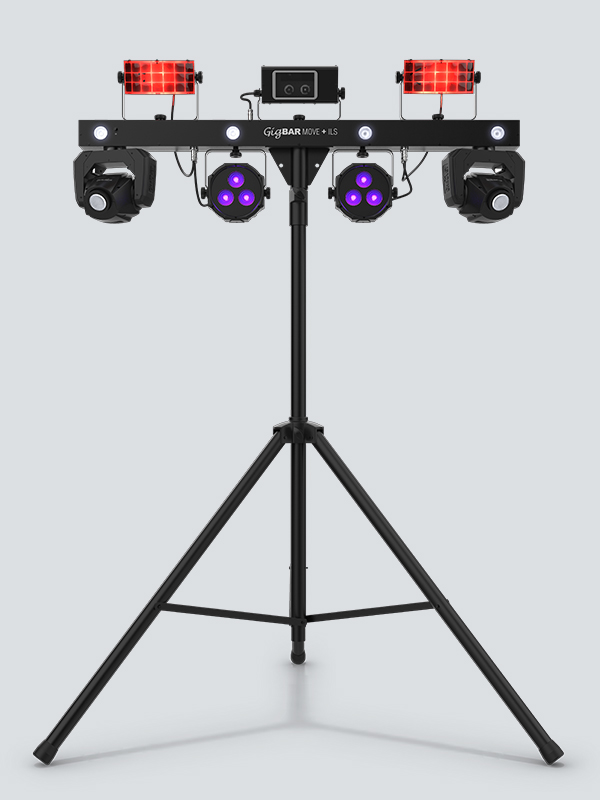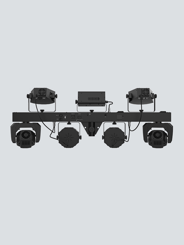 - 5-in-1 lighting system that includes moving heads, derbies, washes, a laser and strobe effect pre-mounted on a single bar
