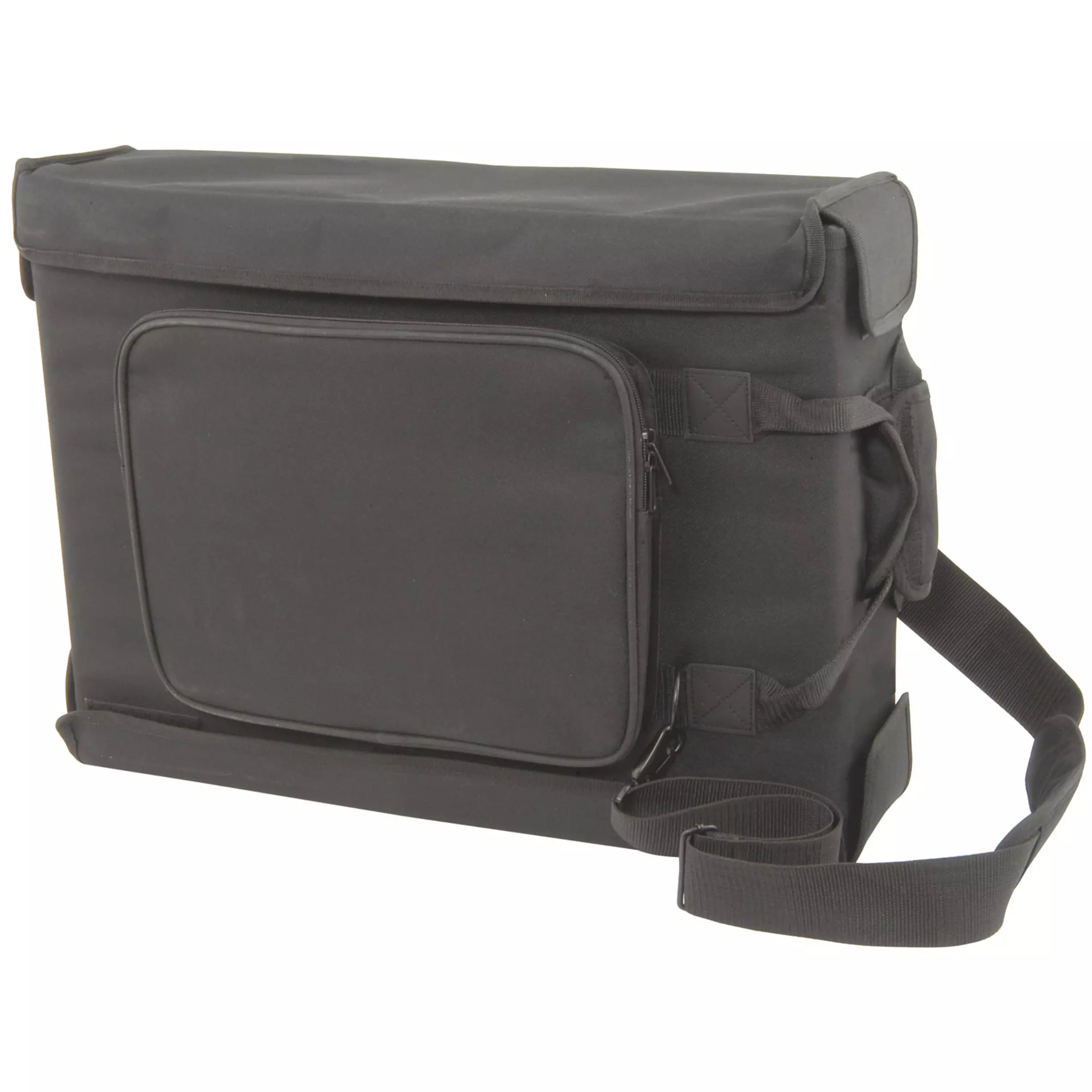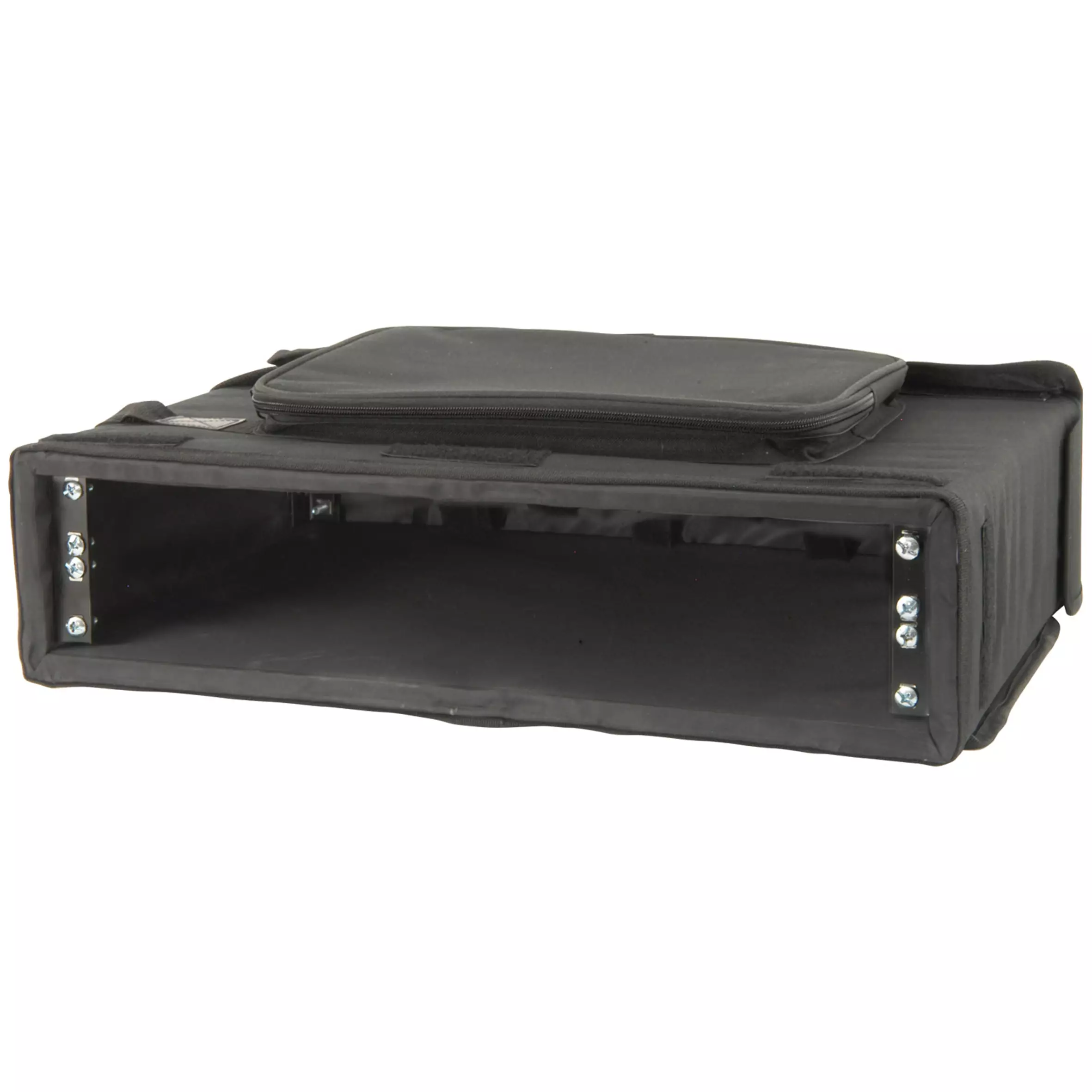 19in rack case in a padded bag with front and rear flaps for access and ventilation. Equipment is protected by an inner wooden frame and secured by metal rack strip front and rear. Also fitted with carrying handle, shoulder strap and zipped outer pocket.