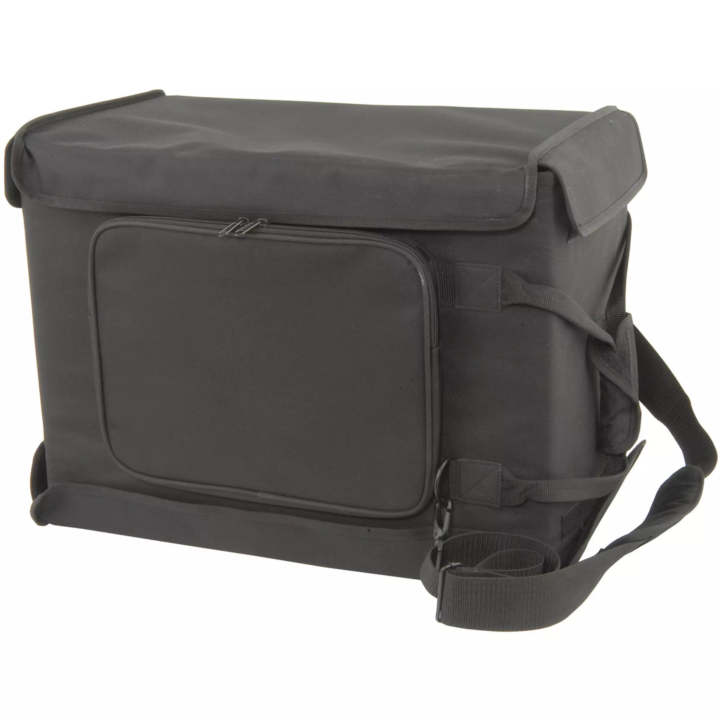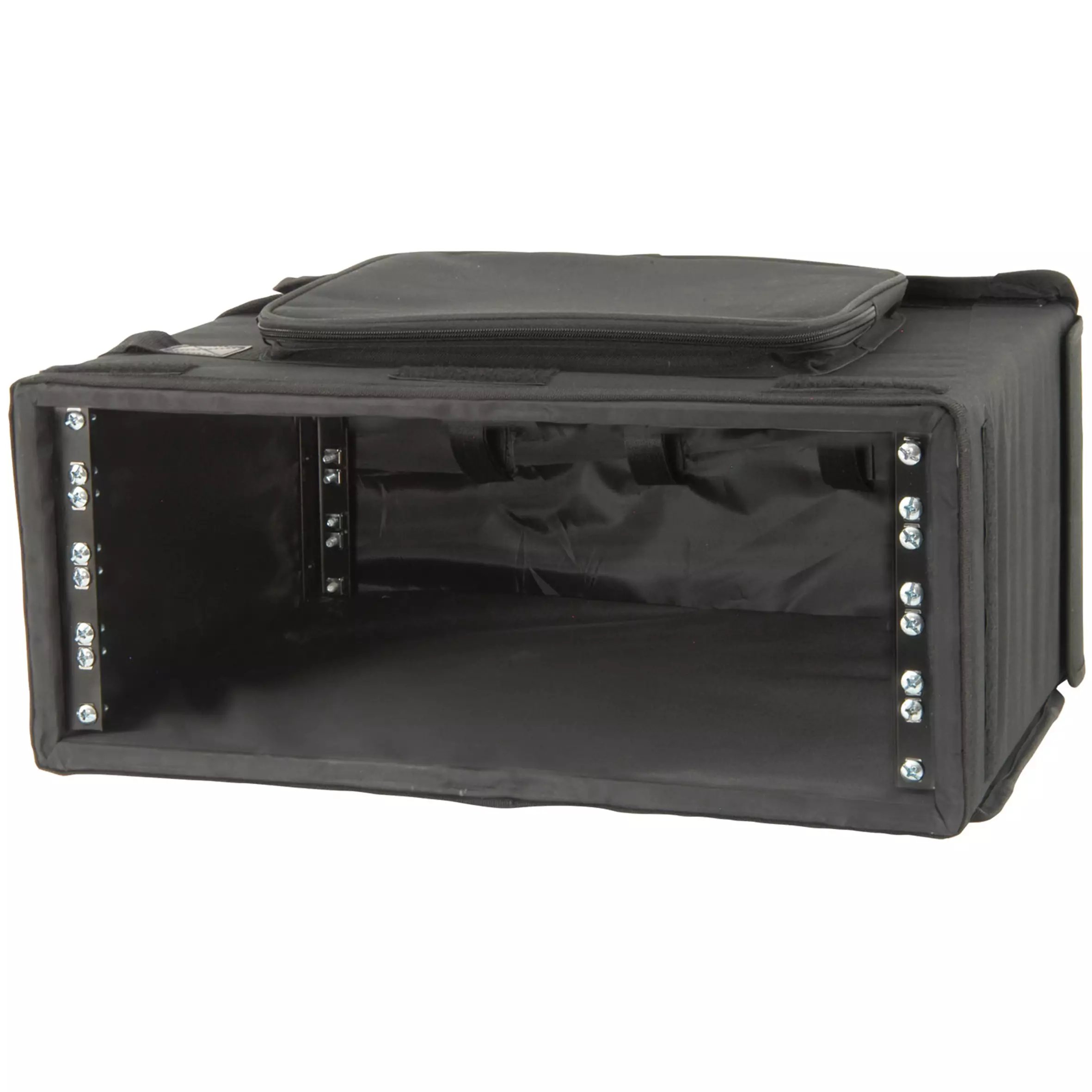 19in rack case in a padded bag with front and rear flaps for access and ventilation. Equipment is protected by an inner wooden frame and secured by metal rack strip front and rear. Also fitted with carrying handle, shoulder strap and zipped outer pocket.
