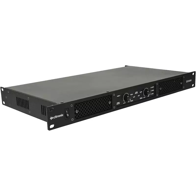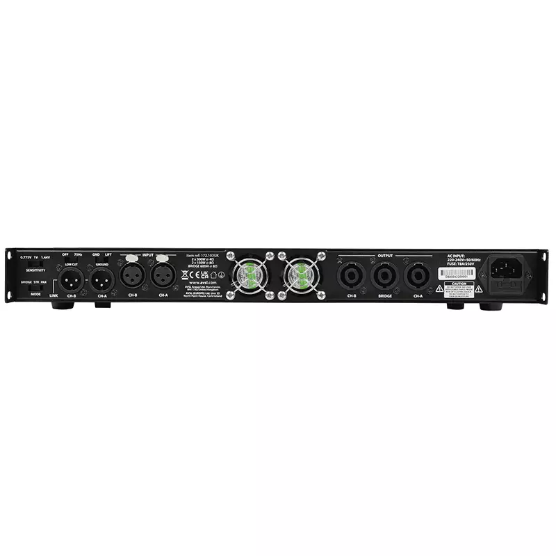 Stereo power amplifier in a lightweight 1U rack-mountable housing. Class-D circuit architecture efficiently converts power into impactful audio for driving medium to large speaker cabinets. Custom cool guide technology ensures consistent and reliable operation and an inbuilt limiter circuit engages at peak output to prevent speaker overload. Options for parallel and bridge mode with selectable input levels and 75Hz low cut filter allow for different configurations to handle even the most demanding of sound reinforcement duties.