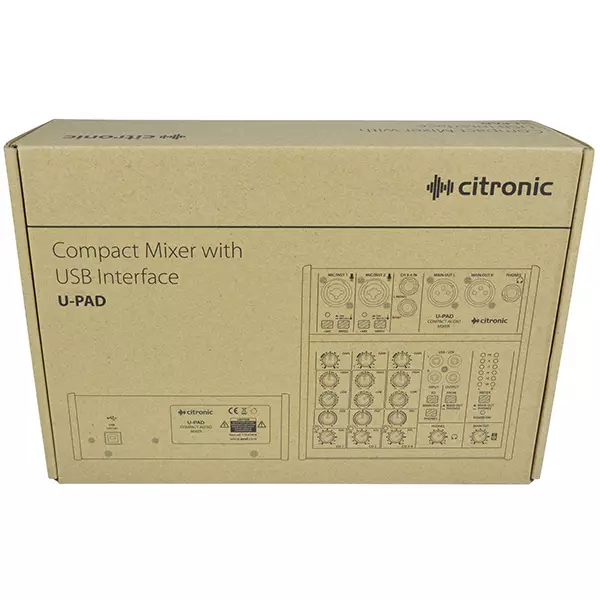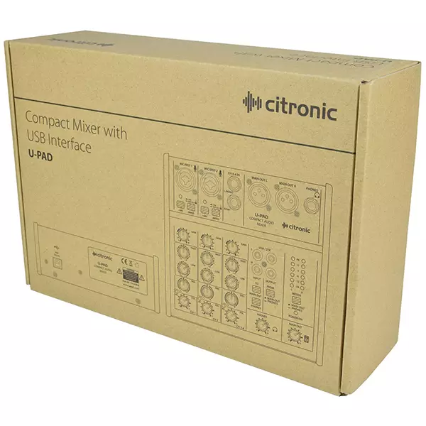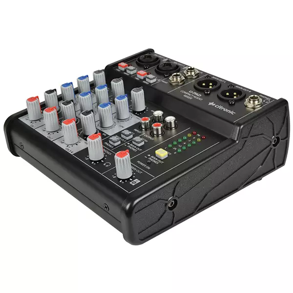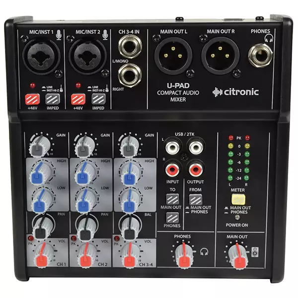 Compact audio mixer with 2 mono inputs and a stereo line input. Both mono channels have a combo XLR/jack input with individually switchable mic/instrument impedance and +48V phantom power for the XLR connector. High/Low EQ and Pan controls are present on all mono and stereo input channels and a digital input from USB can be routed to main output or phones for monitoring. Analogue output is delivered on a pair of balanced XLR connectors and digitally to the USB for recording. When powered from a laptop USB port, the U-PAD offers high quality recording capability in any environment, even on location.