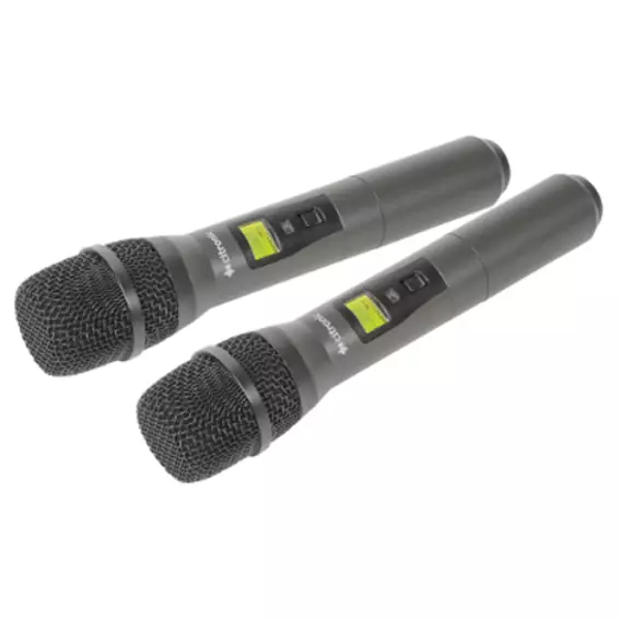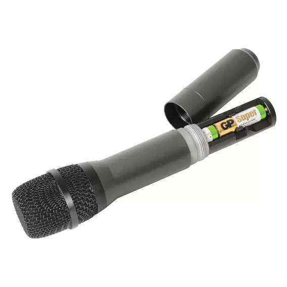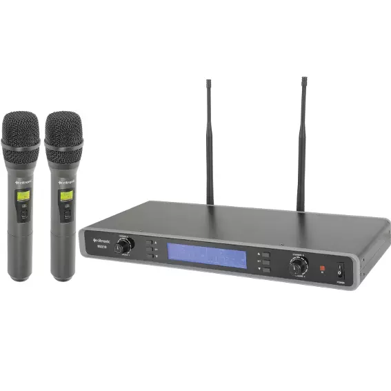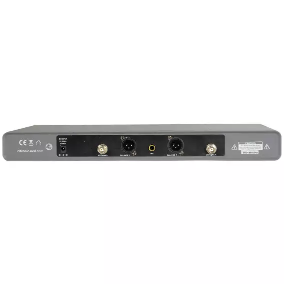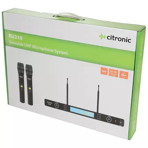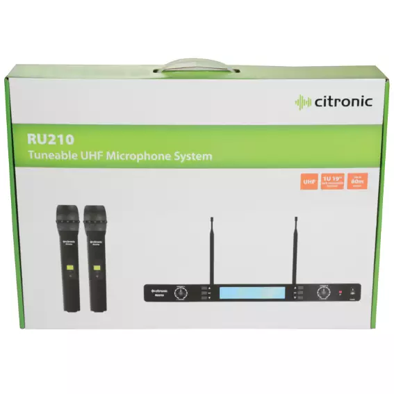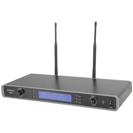 Dual channel PLL tuneable UHF wireless system with 2 handheld transmitters. The receiver unit is compatible with standard 19″ racks using the included rack ears and front mounting antenna accessories. The RF carrier frequency is selected on the receiver and synchronized to the transmitter via infra-red at the touch of a button. Up to 2 RU210 systems can be operated together on the EU licence-free band.