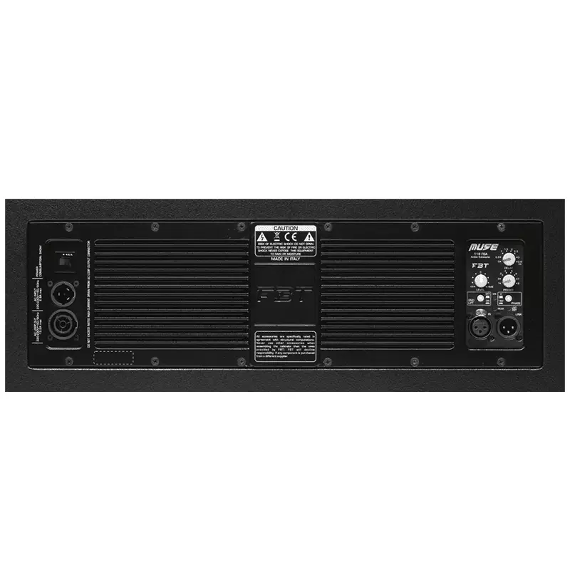 The FBT MUSE 118FSA powered subwoofer meet the following performance criteria: frequency response of 33Hz to 100Hz,Spl cont/peak of 135/139dB half-space. The FBT MUSE 118FSA/FSCAis a hybrid band-pass cardioid arrayable subwoofer design incorporating 1×18″ B&C neodymium magnet high excursion woofer with 3.5″ voice coil. Hybrid configuration permit to obtain extension and speed of vented with high SPL and acoustic filtering of band pass. The FBT MUSE 118FSA/FSCA can be suspended facing forward or rearward with capability of front-or rear mounting the grille and amp module for aesthetic uniformity in cardioid configuration (hardaware fully compatible with MUSE 210). The FBT MUSE 118FSA/FSCA provides a DSP with 8 presets; the control panel provides XLR «in&link», volume, preset, delay, phase 0°-180°, ground lift switch. The FBT MUSE 118FSA/FSCA feature Baltic birch plywood construction covered in a scratch resistant black paint. Ideal for small to medium sized applications in: Theatres, Concert Halls, Clubs, Places of Worship, Conference Rooms, Indoor Sports, Arenas & Stadiums