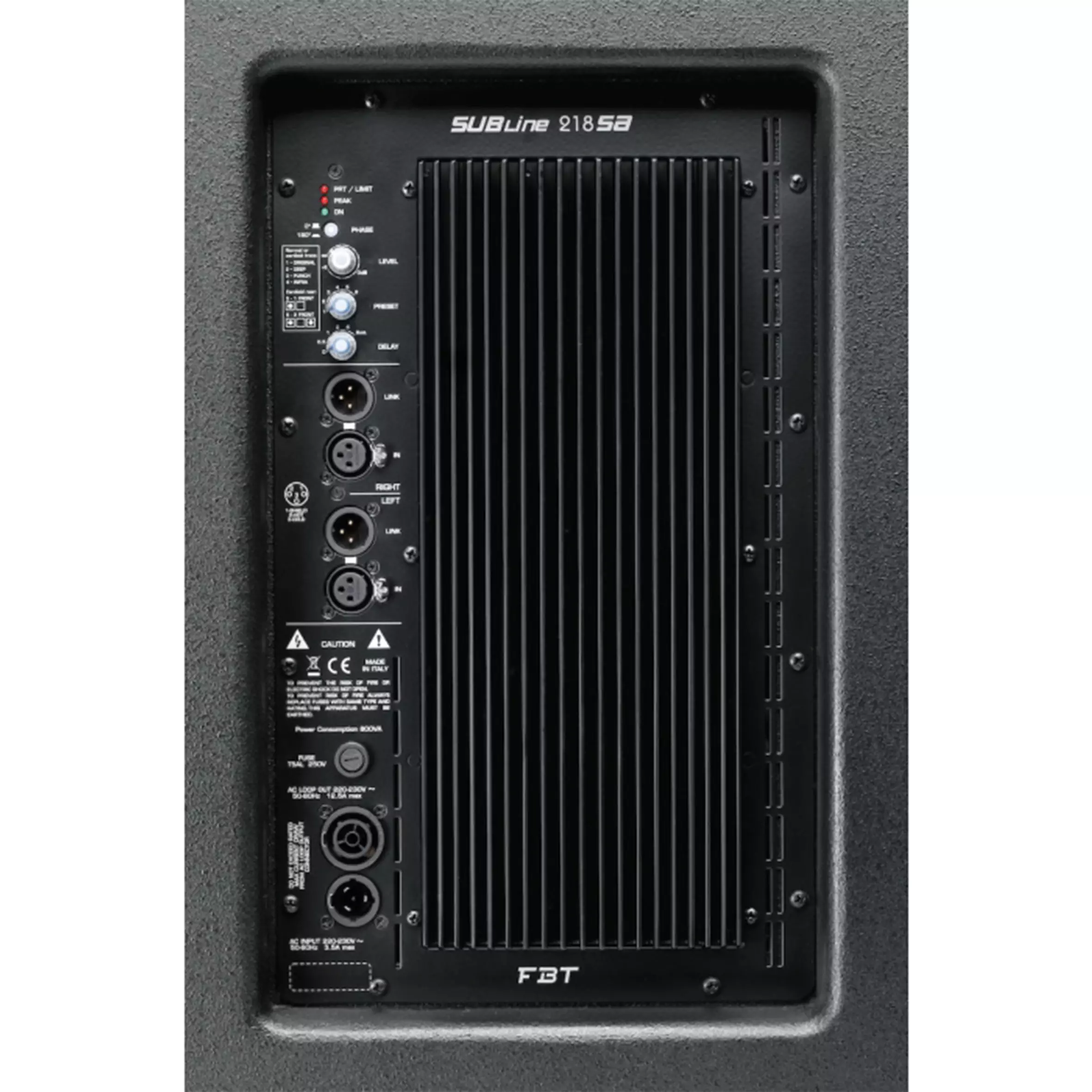 The FBT SUBLINE 218SA, 2 x 18″ bass reflex design subwoofer, is the perfect low-frequency extension and the ideal companion for the FBT MUSE 210LAline array or ground stack applications with optional metal base. The FBT SUBLINE 218SAshall meet the following performance criteria: Frequency response of 30Hz to 120Hz, Maximum SPLof 140dB peak,Class D amplifier 1200W RMS. The FBTSUBLINE 218SAprovides a DSP with 6 presets-cardioid and infra configurations. The FBTSUBLINE 218SA feature 0.70″ Baltic birch plywood construction covered in a scratch resistant black paint with 2 x M20 top-mounted stand adapter and four FBT design aluminium handles. The control panel provides stereo XLR in &out, volume control, preset, delay, phase 0°-180°, 3 status led indicators.