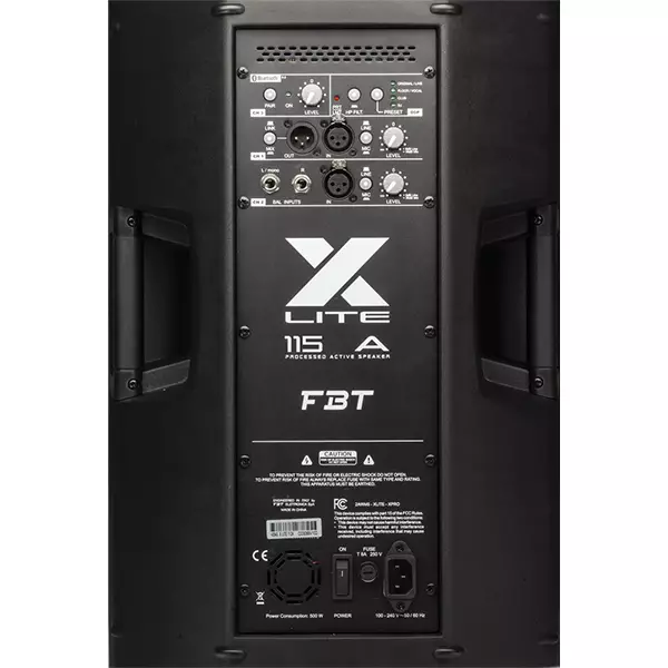 The FBT X-LITE 115A is two way design incorporating a 15” low frequency woofer and 1” HF compression driver coupled to a 90°H x 60°V constant directivity horn. With a frequency range of 42Hz – 20kHz the FBT X-LITE 115A speaker provide high fidelity sound for both speech and music applications with a maximum SPL of 130dB. The bi-amplified FBT X-LITE 115A active speaker feature a 1200W low frequency amp and a 300W high frequency amp. The control panel features a three-channel mixer with two micro-line inputs, a stereo input and a dedicated channel for bluetooth 5.0; two XLR inputs, stereo input, XLR output with ch1 or mix link selector, hp filter, two mic-line selectors, DSP preset selector, Bluetooth 5.0 with pairing led. 4 x M10 rigging points built-in into the cabinet along with the optional mounting brackets allow the FBT X-LITE 115A speaker to be surface mounted on walls or ceilings.