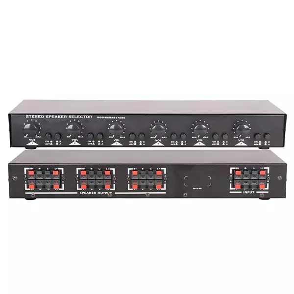 This matrix switcher for stereo amplifiers has 2 inputs and 6 outputs. Any of the inputs may be routed to any of the outputs, or the same input may be routed to all outputs or any combination. Simply connect the output of the amplifiers to the inputs, these inputs can then be routed to four different stereo speaker sets in four different locations, each speaker set can be individually activated via the push buttons on the front of the box and individual volume controls.