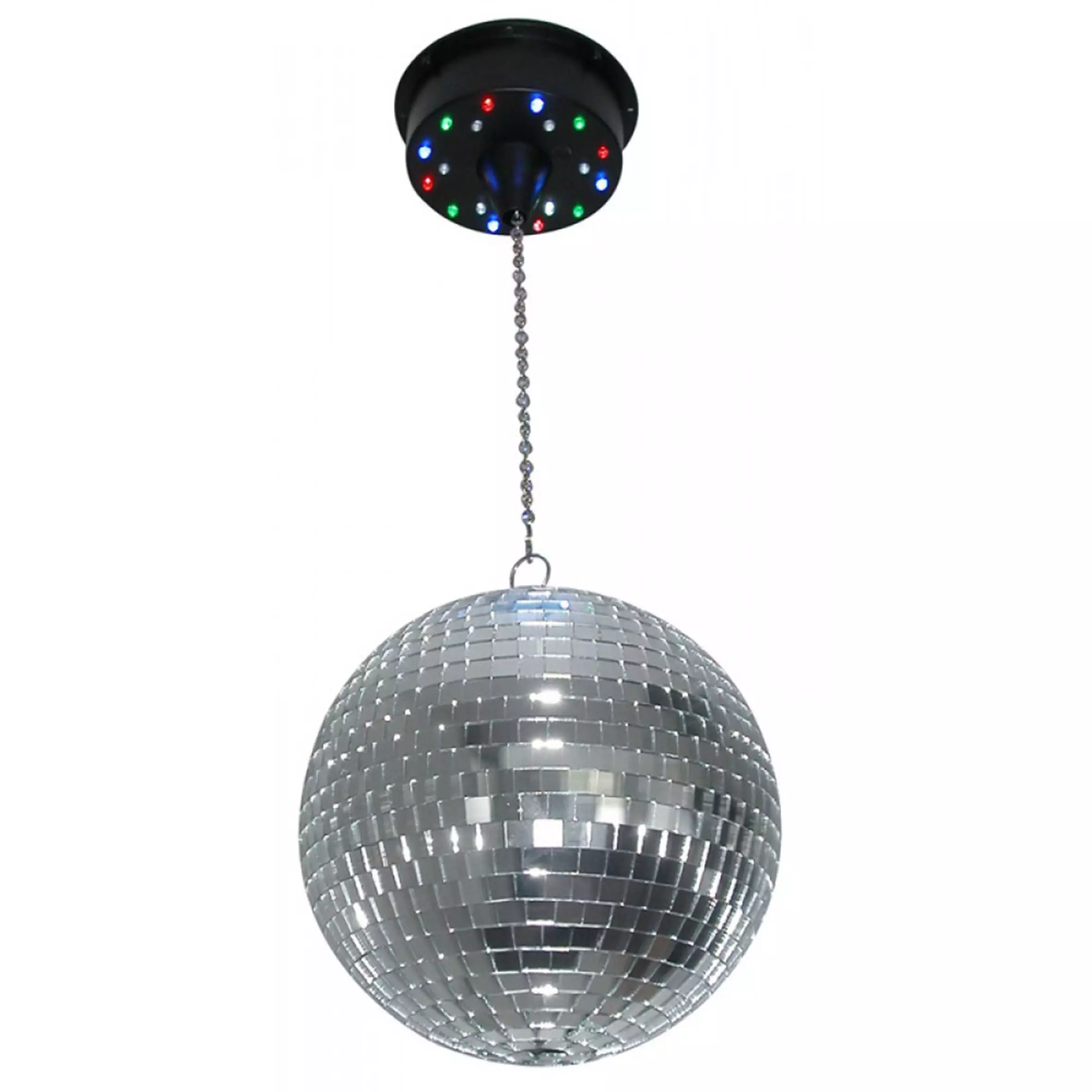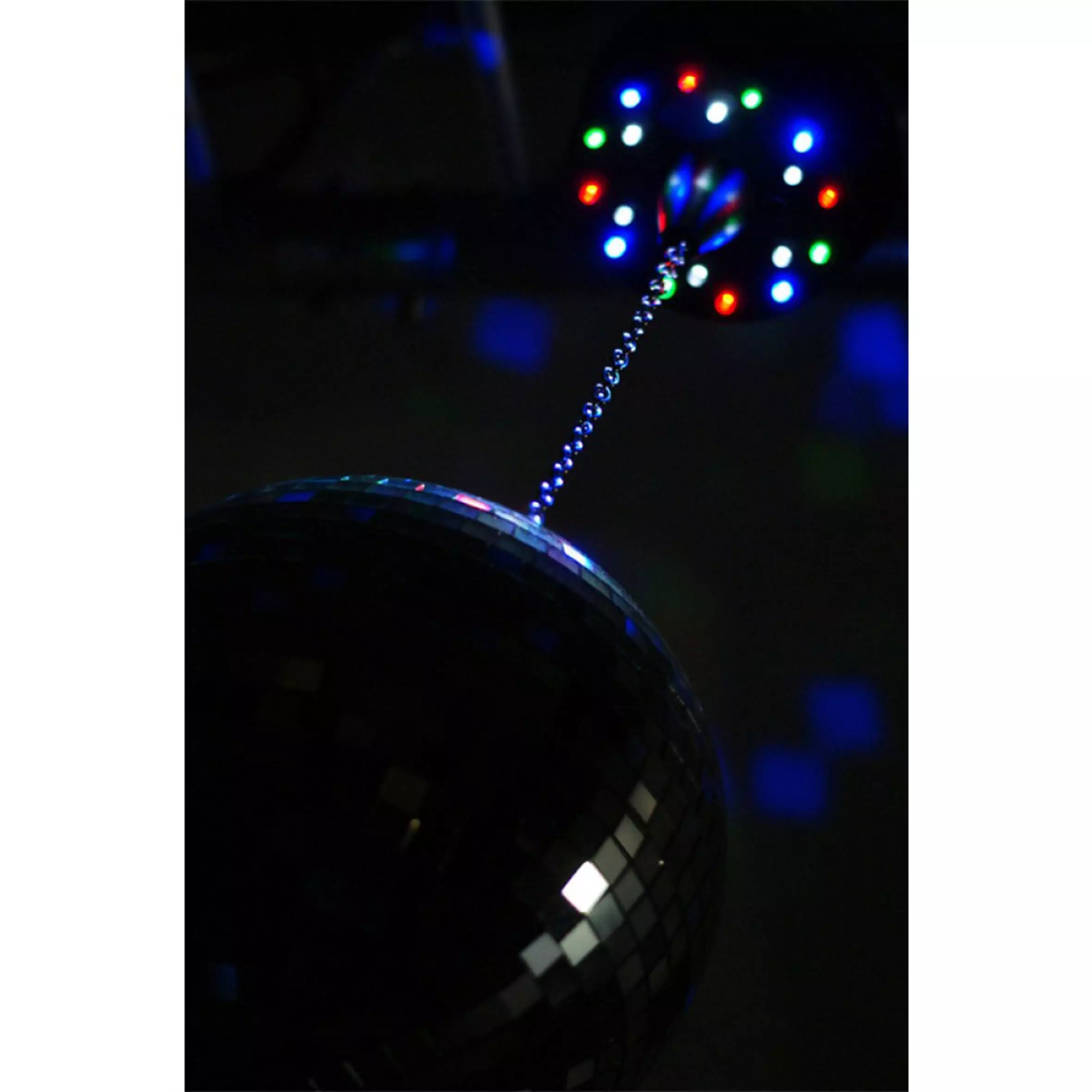A battery powered Low-noise motor for mirror balls up to 2 kg fitted with 18 coloured LEDs. Especially in the dark this produces a stunning effect. Stand alone or sound activated.