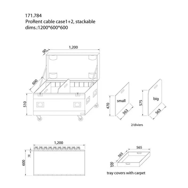 One large and solid cable case for storing all “Roadie” necessities. No more mounting materials, wires, cables, microphones, etc. laying around. The case is made of solid laminated plywood. With flip-handles, butterfly latches and 3.5 ” wheels (2 lockable). Supplied with 2 moveable partition panels and tray cover with carpet.