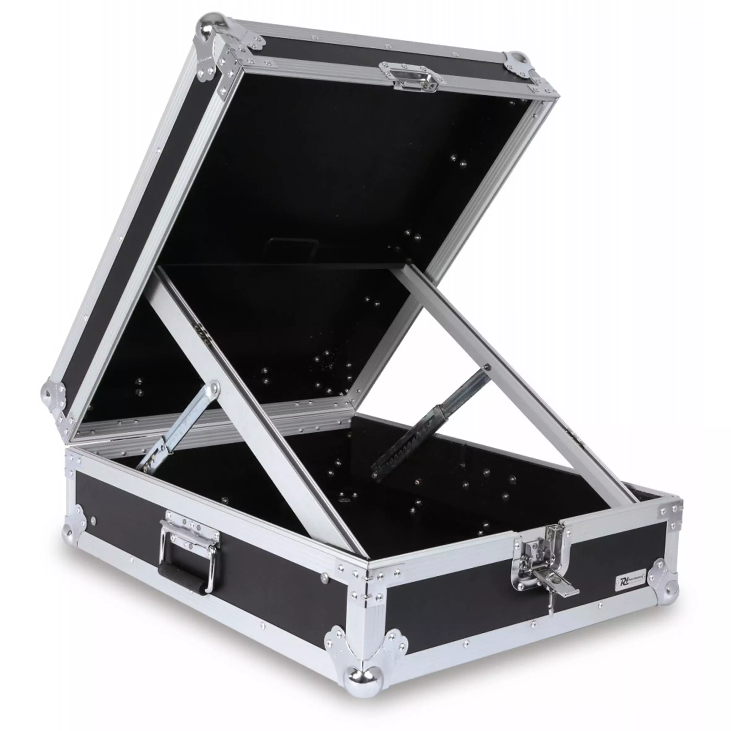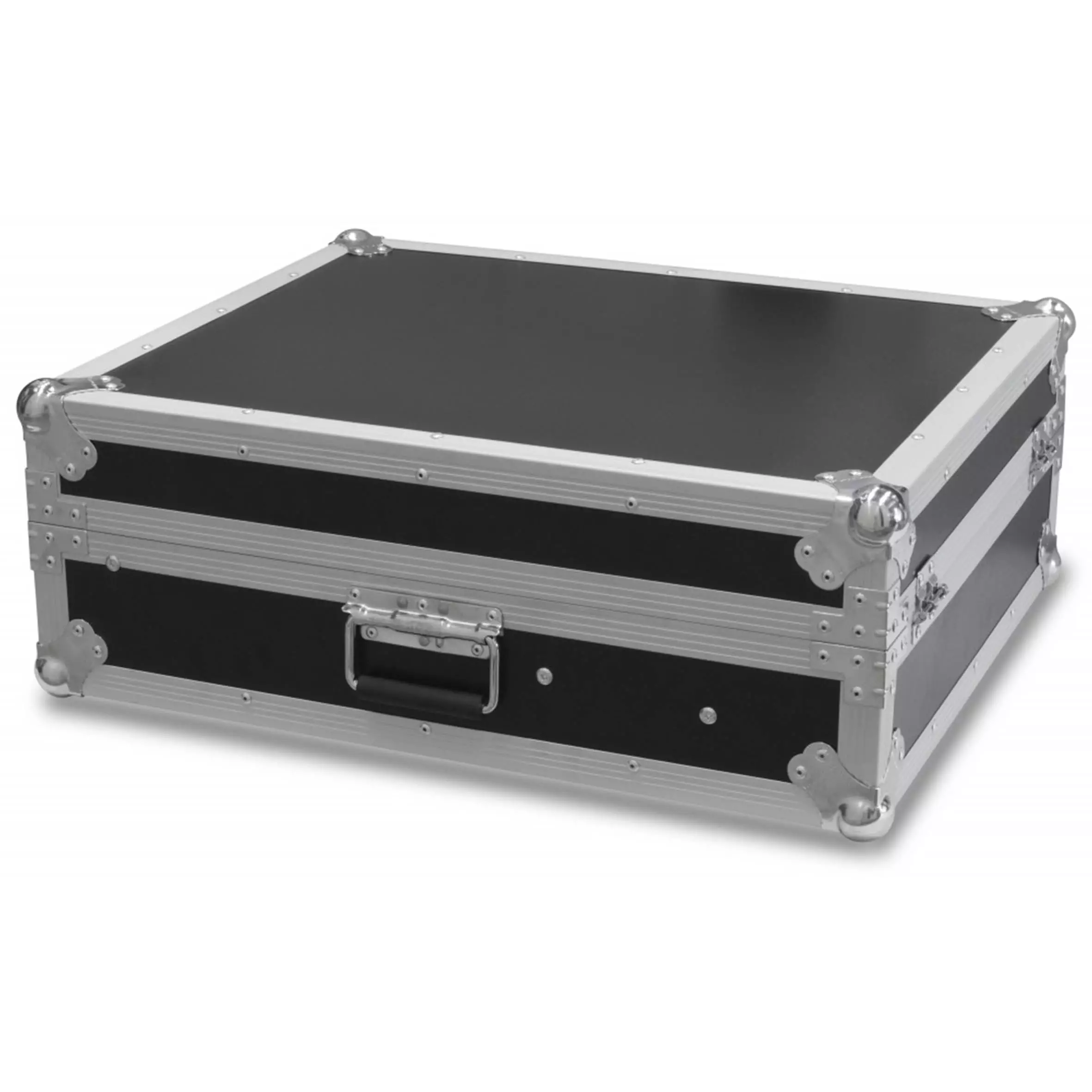 In this flightcase mixers up to 14U high can be placed and transported. Inclined position of the profile rails for optimum performance with your mixer, controller etc.. Plywood with black coating, aluminum profiles, steel chromed ballcorners and hook-over hinges. The flightcase is nicely finished and comes with two spring-loaded handles and a butterfly latch.