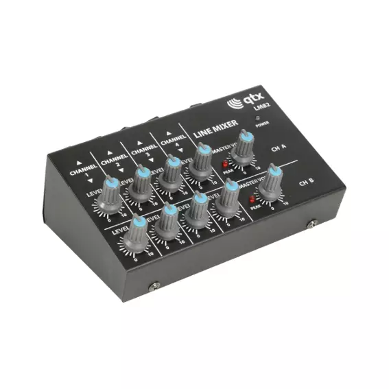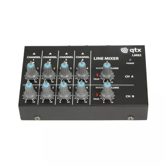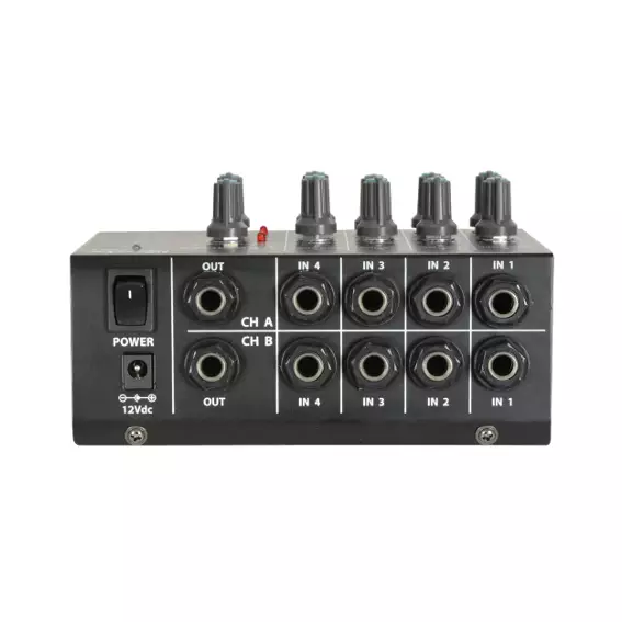 Compact mixers with high impedance jack inputs suitable for auxiliary line level or instruments, mixing to a master jack output. Available as either 4 mono or 4 stereo version with separate volume controls for each input and master output. Powered by 1 x 9V battery or optional 12Vdc adaptor