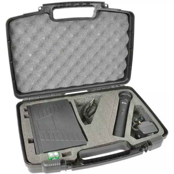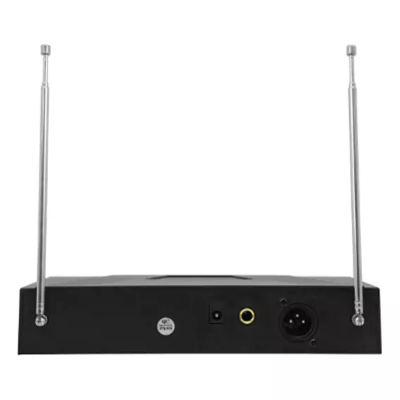 A VHF wireless microphone system with a half-width 1U receiver and a handheld transmitter.