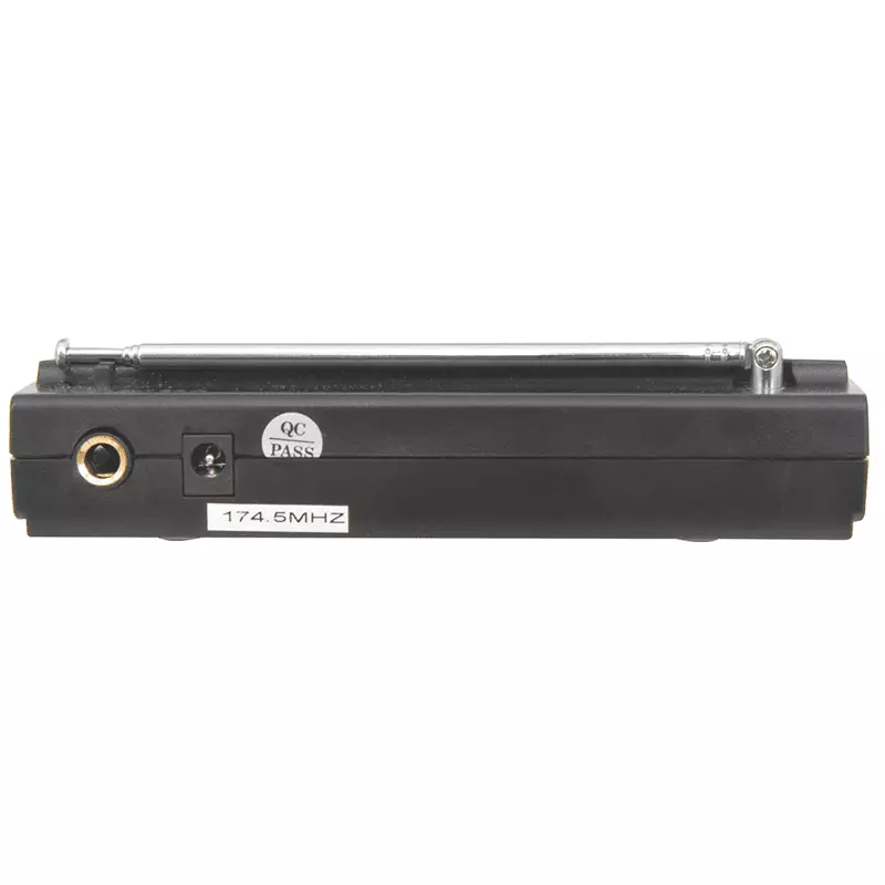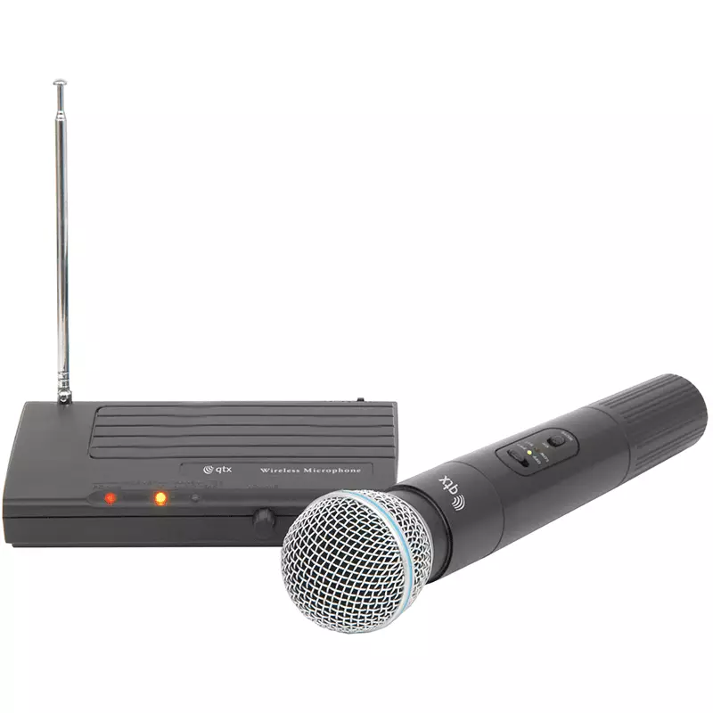 Handheld VHF wireless microphone with desktop receiver, supplied with power supply, batteries and signal lead.