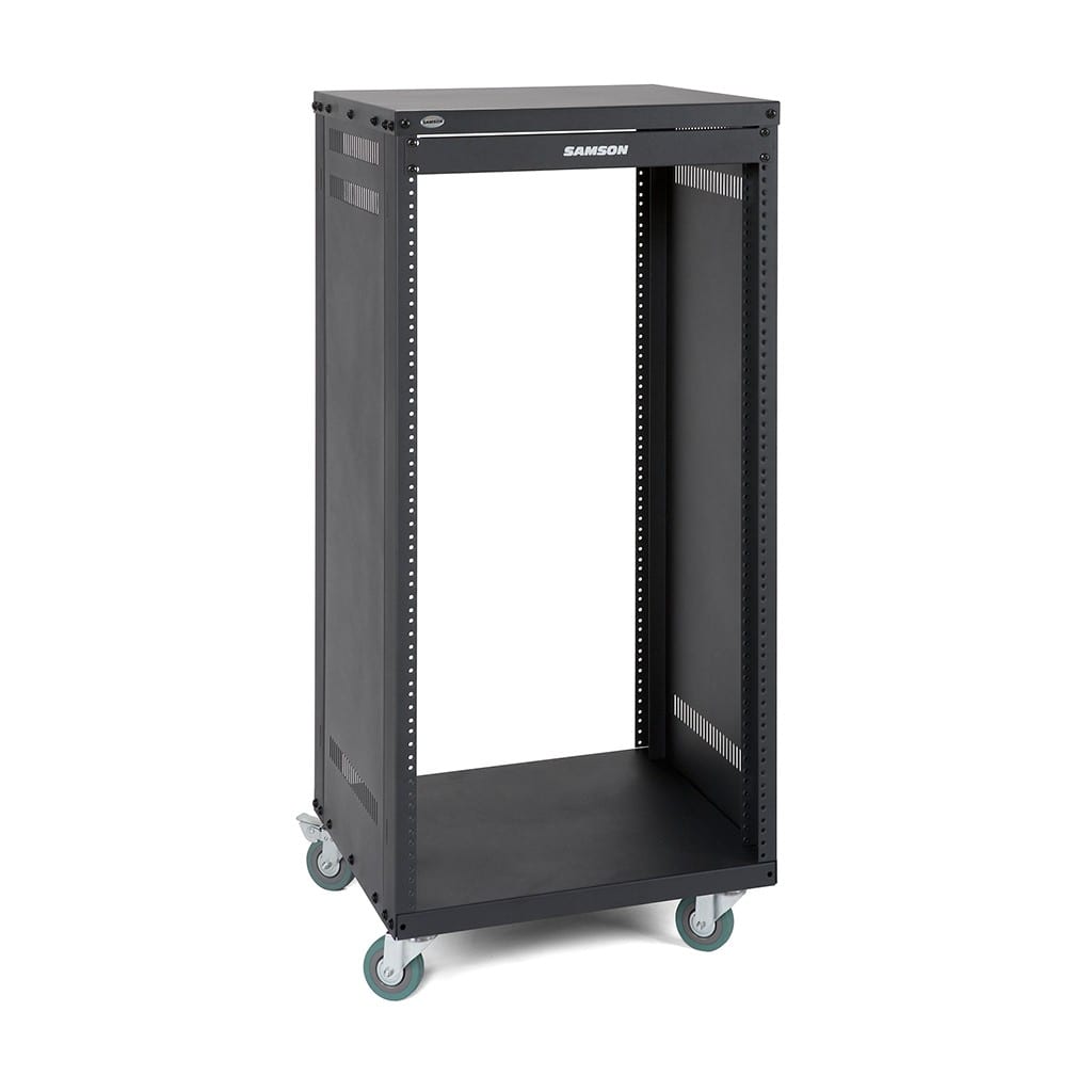 Samson’s rugged equipment racks are solid steel and feature fully enclosed steel side panels. The racks are set upon 4 heavy-duty, 3-inch (75 mm) casters with locking fronts. Each Samson equipment rack includes a single-space, flanged blank panel. The truly innovative thing is that the unique steel support bar construction allows the racks to be assembled to accept either the European or US thread sizes.
