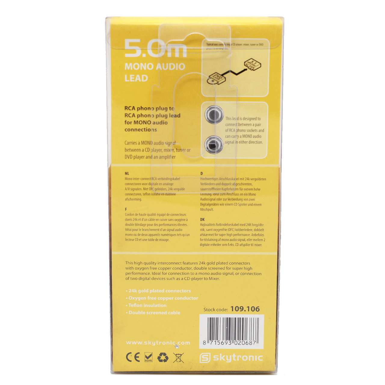 This high quality interconnect features 24k gold plated connectors with oxygen free copper conductors, double screened for super high performance. Ideal for connection to a mono audio signal, or connection of two digital devices such as a CD-player to Mixer.